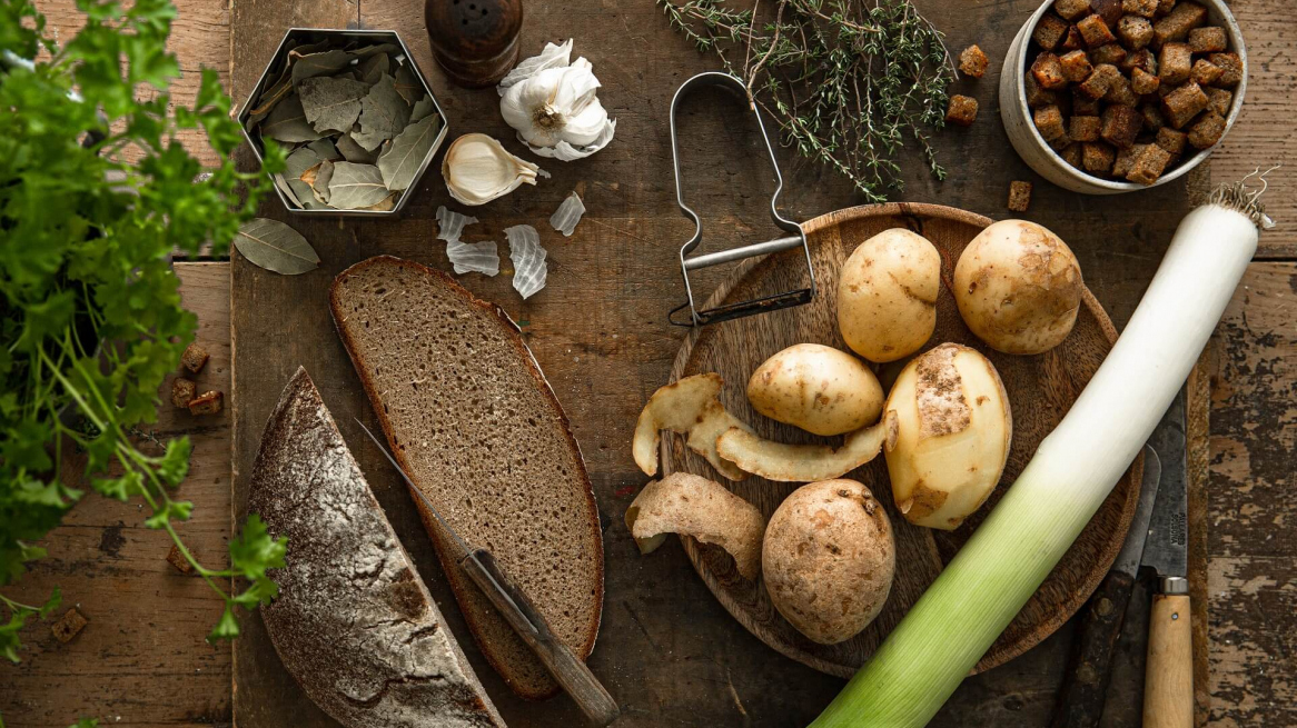 Für die gerösteten Schwarzbrotwürfel das Brot in Würfel schneiden und in einer Pfanne mit dem gepressten Knoblauch und etwas Olivenöl so lange rösten, bis diese schön knusprig sind. Die fertigen Brotwürfel aus der Pfanne geben und die Speckwürfel (ohne Zugabe von Öl) knusprig anbraten. Petersilie waschen, trocken schütteln, die Blättchen mit einem Geschirrtuch trocknen, grob hacken und die Suppe gemeinsam mit der Petersilie, den Schwarzbrot- und Speckwürfel anrichten.