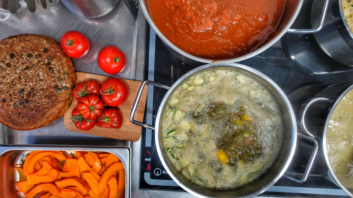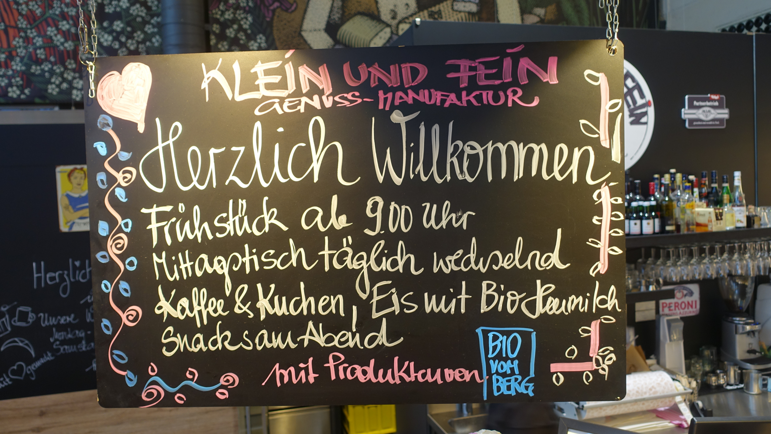 Was mich am Konzept von ‚Klein und Fein’ auch beeindruckt: die restlose Verwertung von Lebensmitteln. Aus altem Schwarzbrot werden Knödel gemacht, das immer noch einwandfreie, aber nicht mehr verkaufbare Gemüse eines befreundeten Händlers in der Markthalle wird zu Gemüsesuppe. In der Hochsaison kann’s passieren, dass ein Bauer plötzlich mit 40 kg BIO-Himbeeren vor der Tür steht, weil die Sommerhitze zu großen Mengen geführt hat, die innerhalb der kurzen Zeit nur schwer zu vermarkten waren. „Dann zaubern wir daraus aller feinste Marmelade und frieren einen Teil ein“, erklärt Petra stolz. ‚Überschüssige BIO-Äpfel‘ werden zum zuckerlosen Apfelmus. Die Tomatenschwemme eines Oberländer BIO-Bauern ermuntert die ‚Klein und Fein‘-Belegschaft Sugo, Ketchup und eingelegte, getrocknete Tomaten quasi auf Lager herzustellen.