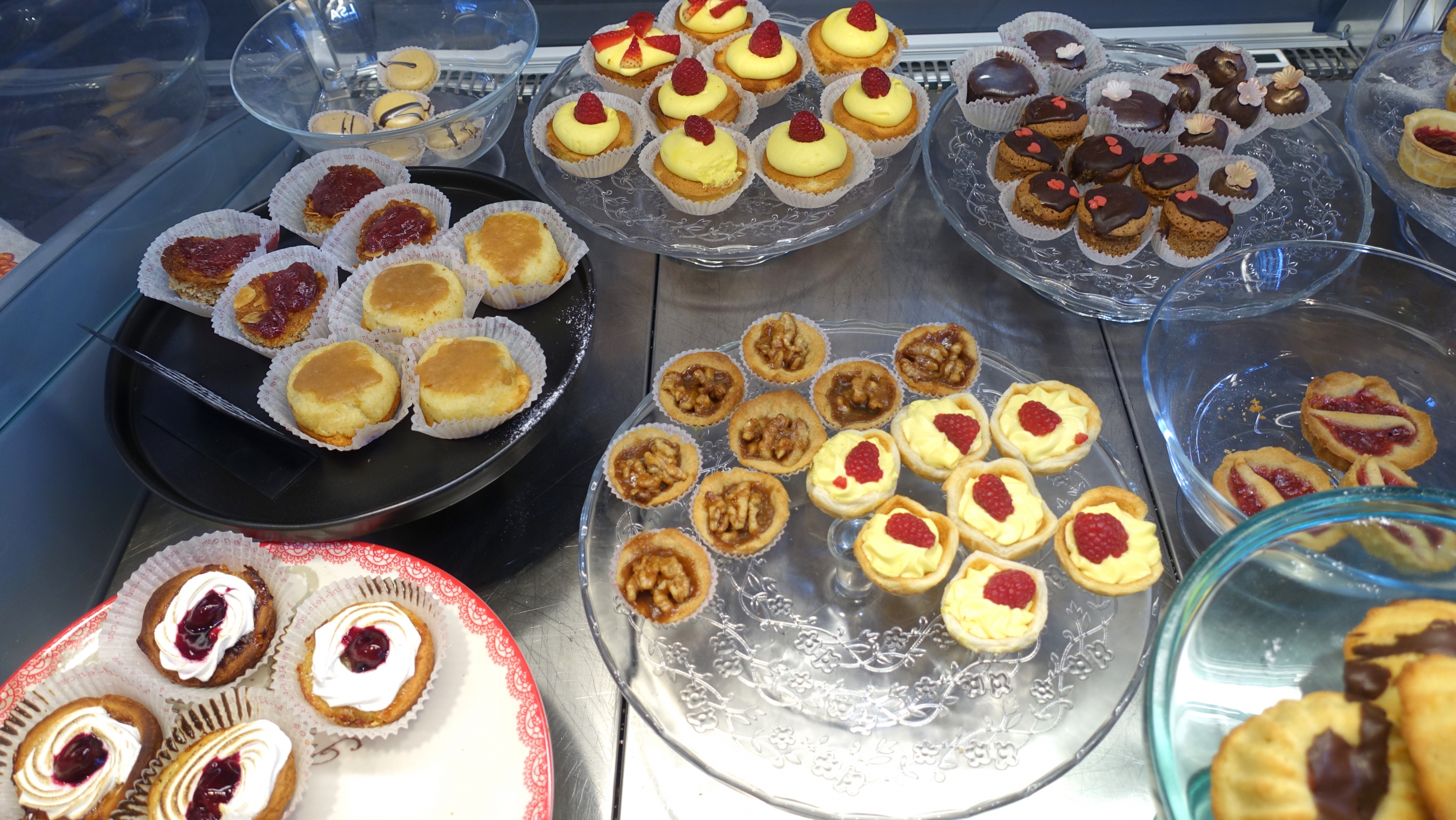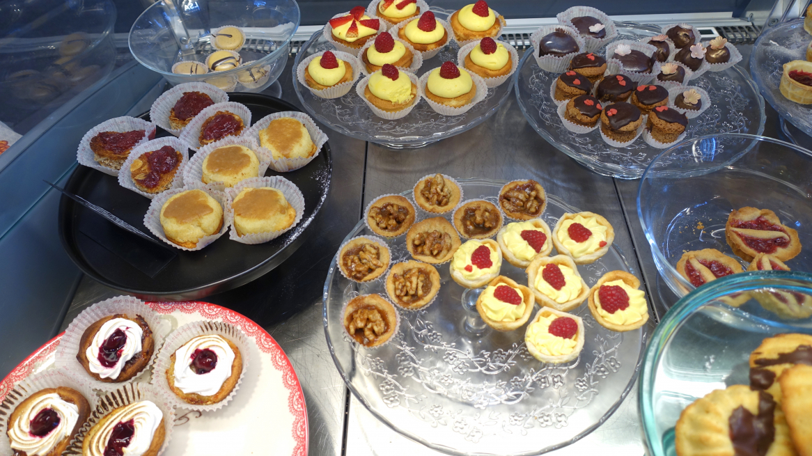 „Selbstgemachte Marmeladen, Säfte, Sirupe, Ketchup oder Chutneys waren für uns immer schon selbstverständlich“, meint Petra bescheiden. Genauso wie die Süßigkeiten, für die die Chefin berühmt ist. Ein täglich wechselndes Kuchen-Törtchensortiment ist da quasi logo. Cantuccini, Amarettini, Schokoküsse, Marillenaugerl, Cookies, diverses Mürbteiggebäck – mehr brauche ich vermutlich nicht zu sagen. Ein Warnschild verweist denn auch darauf, dass ‚Kuchenstücke unter 300 Gramm‘ hier als Kekse gelten.
