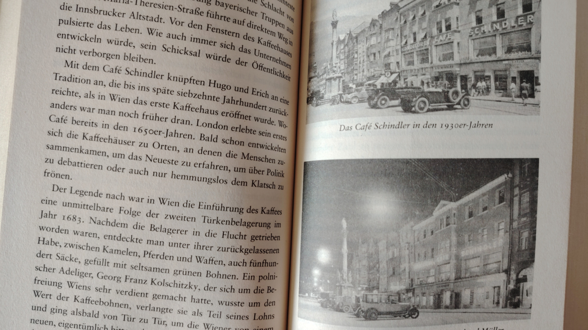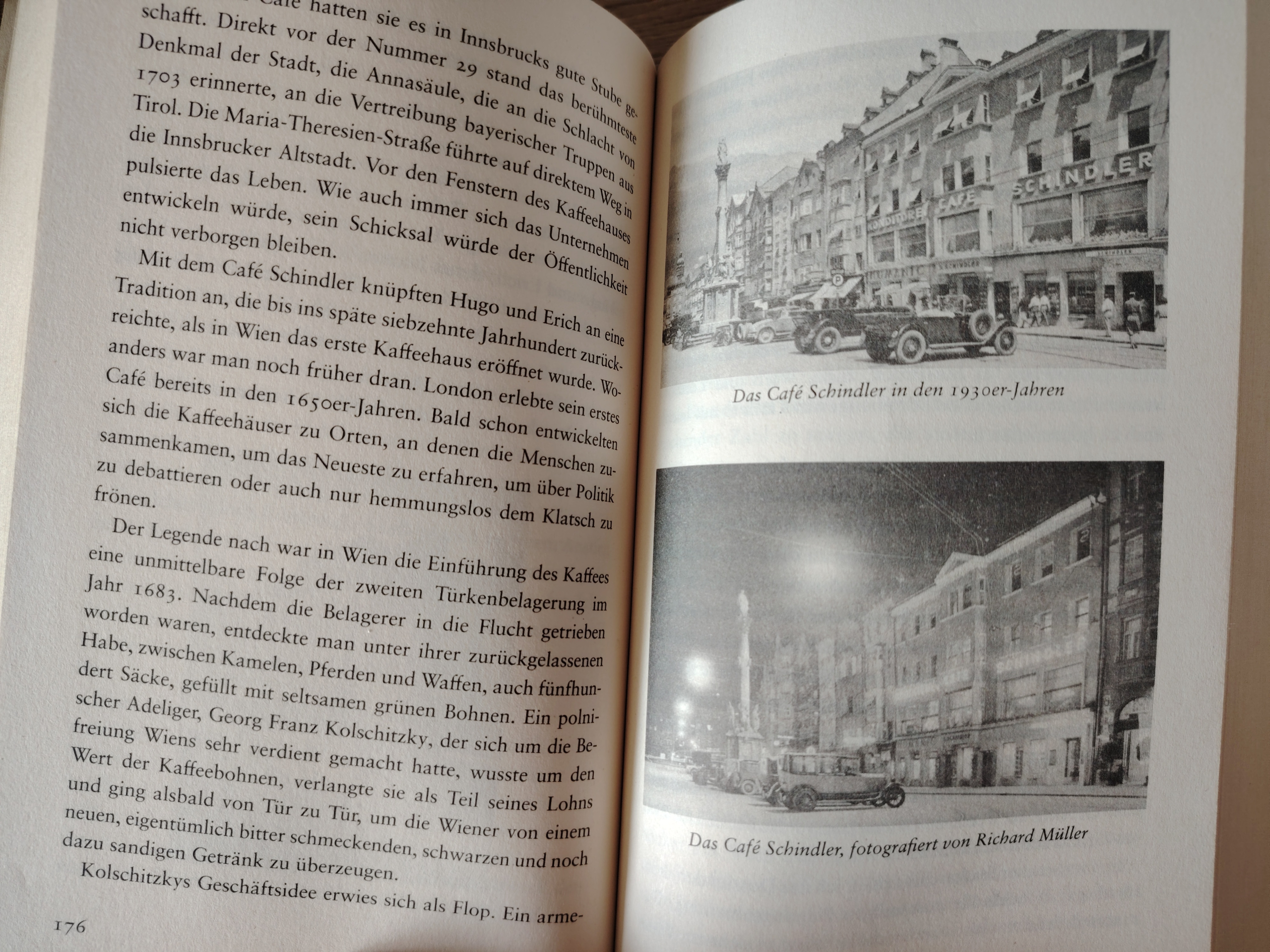 In „Café Schindler“ begibt Meriel Schindler sich auf die Suche nach der Wahrheit ihrer Familie und des Cafés Schindler. Das Café Schindler war bzw. ist seit seiner Gründung 1922 eine der bekanntesten Adressen in Innsbruck. Damals war es der Treffpunkt schlechthin – bis die Nazis kamen. Die Enkelin eines der Gründer geht ausgehend von Fotos und Papieren der eigenen Familiengeschichte auf den Grund und beschreibt die Zeit während, zwischen und nach den Kriegen ausführlich und sehr detailliert.