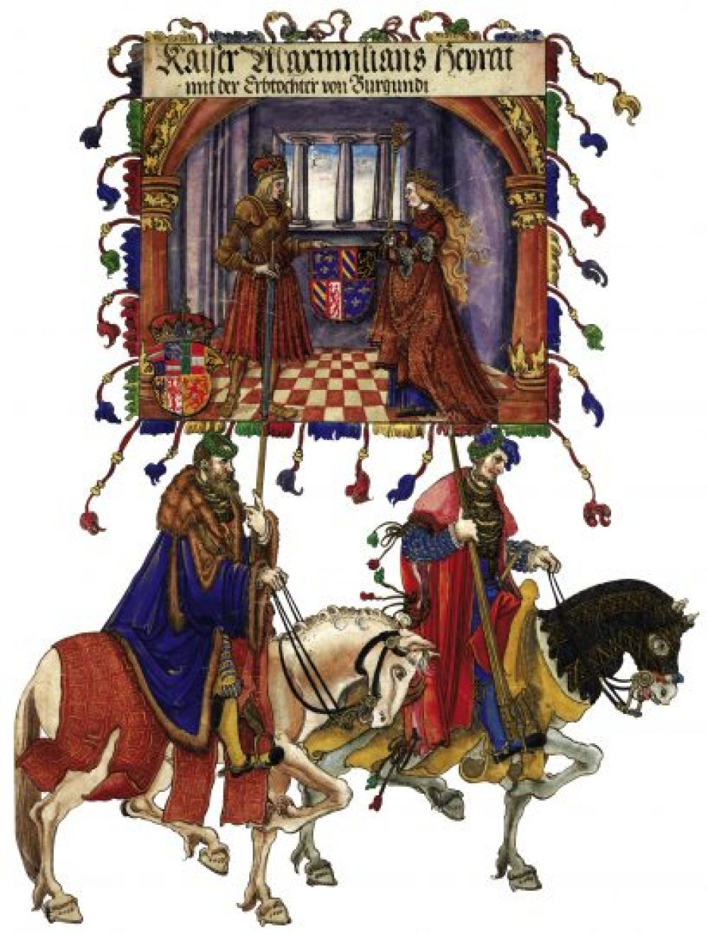 Die Habsburger Heiratspolitik führte ihn zu seiner großen Liebe, Maria von Burgund. Die beiden hatten zwei gemeinsame Kinder, Philipp den Schönen und Margarete. Doch das Glück im reichen Herzogtum währte nur kurz, Maria starb jung nach einem Reitunfall. Trotzdem prägten Maximilian diese Jahre in Burgund sehr, vor allem seinen Sinn für Kunst.