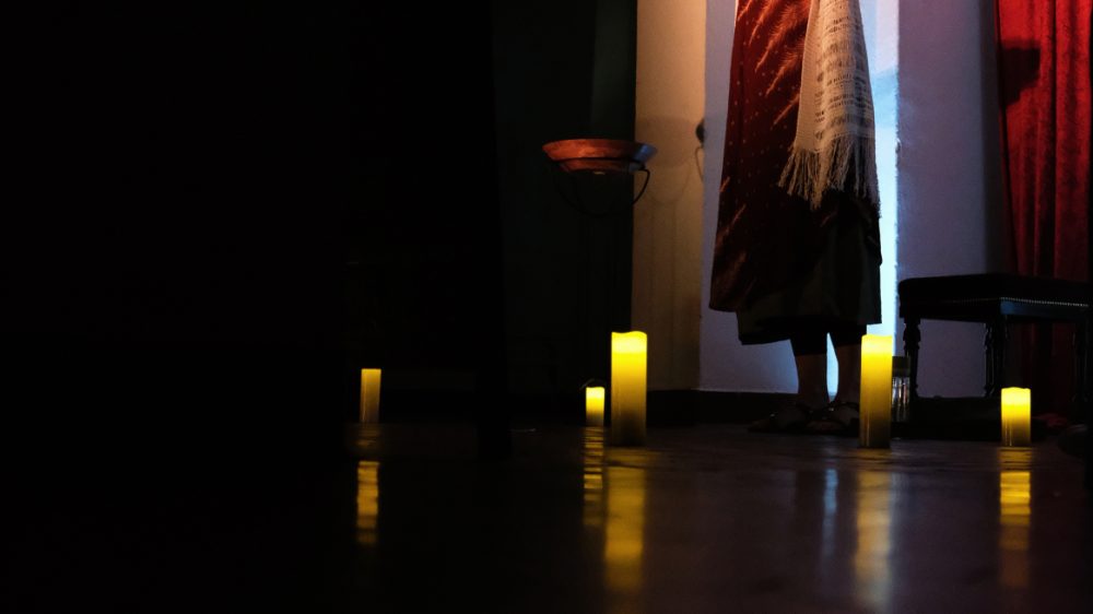 In das zum Kirchenraum samt Beichtstuhl umfunktionierte Foyer flüchtet Carmen Gratl. Foto: © Carmen Sulzenbacher