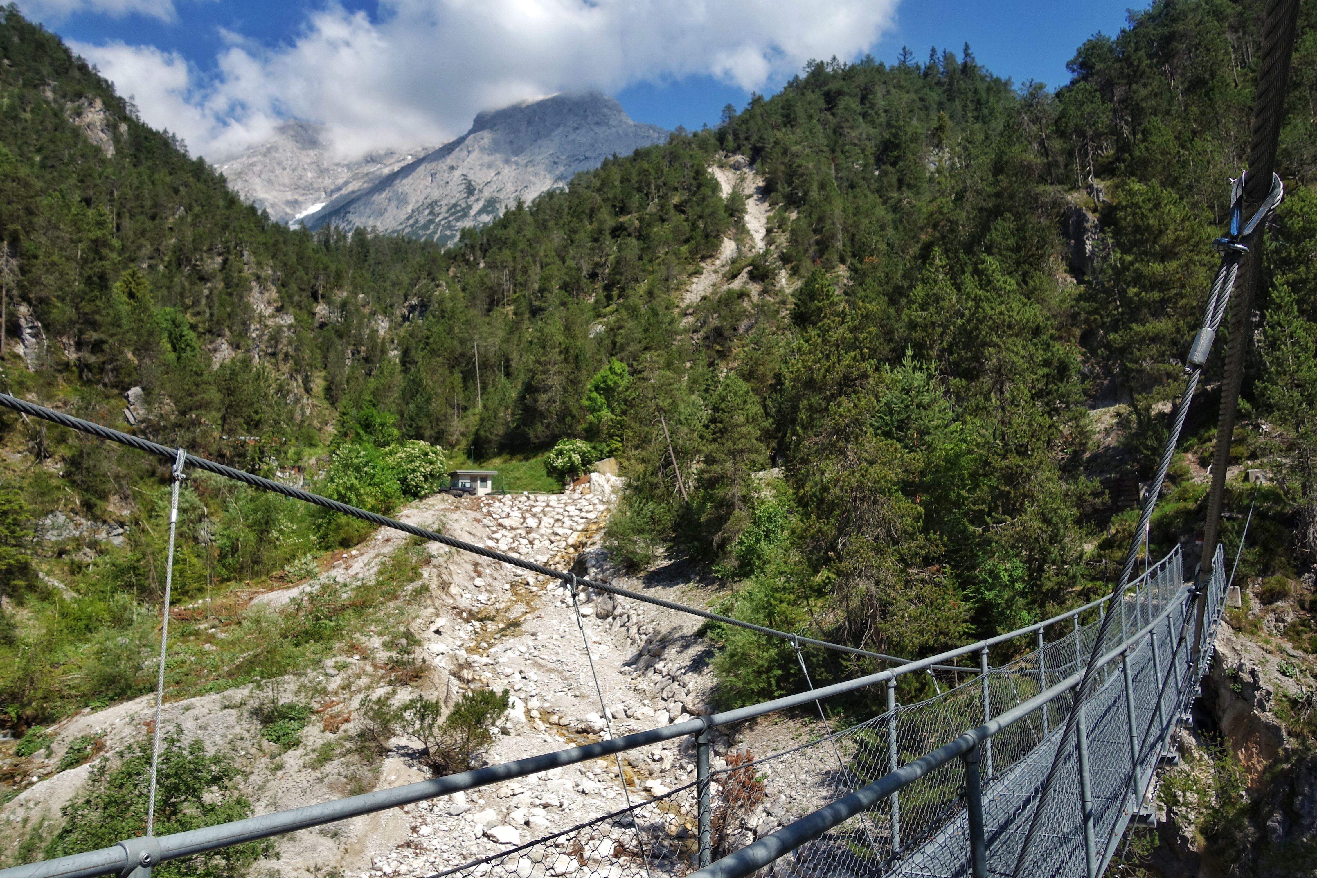 Nach dem Durchsteigen der Felswand geht’s dann eher gemütlich dahin. Aber nun wartet erneut ein kleines Abenteuer: jetzt muss auch noch die stählerne Hängebrücke überwunden werden. Vor allem für Kinder ein echtes Abenteuer. Aber auch für Erwachsene, die auf der meist leicht schwankenden Brücke bisweilen Gänsehaut-Feeling verspüren. Ein letzter Anstieg bringt die Wanderer schließlich zu einer Forststraße die einige hundert Meter später im Gasthof Strassberg ‚mündet‘.
