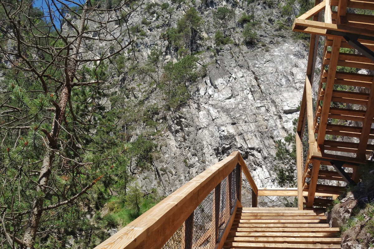 Als 2014 ein Felsabbruch den beliebten Klammweg durch die Zimmerbergklamm verlegt hatte und zu allem Überdruss 2016 ein Hochwasser verbunden mit einer Mure gleich zwei Brücken mitgerissen hatte, schien der Klammsteig am Ende. Weit gefehlt. Denn das konnten und wollten die Telfer nicht auf sich sitzen lassen. Pläne wurden geschmiedet, wie der Felsabbruch sicher zu umgehen war. Das Ergebnis lässt sich sehen. Seit heuer gehört der ‚neue‘ Klammsteig zu den absoluten Wander-Attraktionen im Oberland für Jung und Alt. Der Weg weist denn auch einen wirklichen Höhepunkt auf: den hölzernen Steig durch nackten Fels.