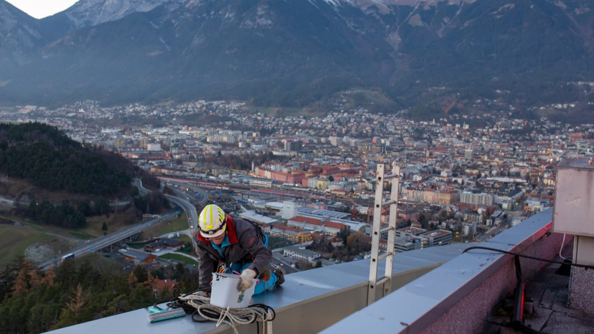 Kühles, windstilles und niederschlagsfreies Herbstwetter ist optimal. Keine Chance bei Regen oder Schnee. Gefährlich bei Wind. Vor allem wenn Südföhn weht! Sechs bis sieben Stunden hänge ich im Seil und putze – der Rest des 10- bis 11-Stunden-Tages sind Vorbereitungen wie Seile versetzen, Vorbereiten der Arbeitsmittel und meiner Ausrüstung, Reinigen der Arbeitsmittel und Nachbereitung, Absperrungen am Boden (bei Notwendigkeit).