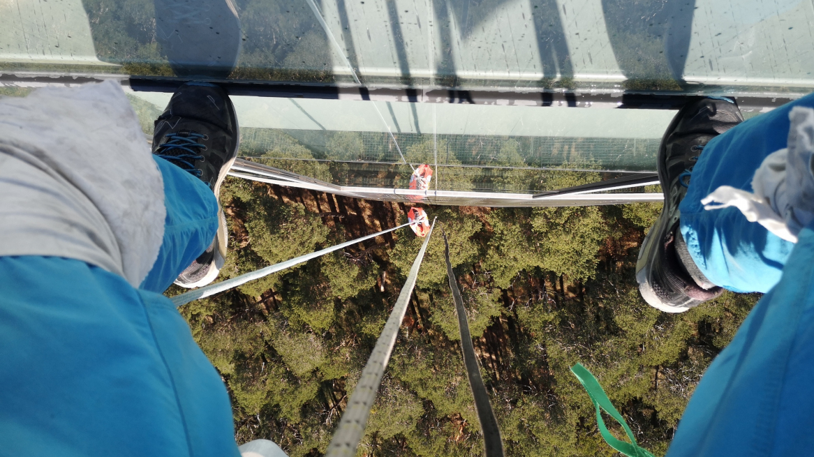 Der Blick nach unten – ganze 50 Meter müsste sich Andreas im Notfall zum Boden abseilen. ©Andreas Höller