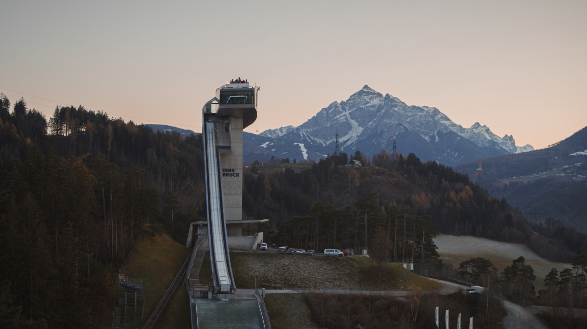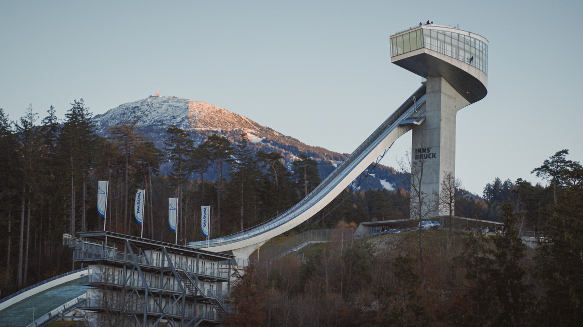 Die Skisprungschanze mit Blick auf die Serles im Hintergrund. Rechts an der Schanze kann man die Seile gut erkennen. ©Innsbruck Tourismus