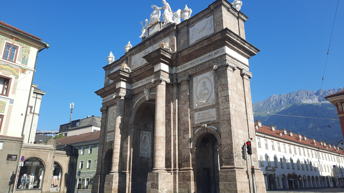 Eine der interessantesten Geschichten mit Breccienbeteiligung dreht sich um die Triumphpforte. Sie ist quasi ein Recyclingbau. Zuvor war nämlich eines der alten Stadttore abgetragen worden (der heutige Eingang zur Altstadt von der Maria-Theresien-Straße kommend). Die so frei gewordene Breccie verbaute man dann in der Triumphpforte.