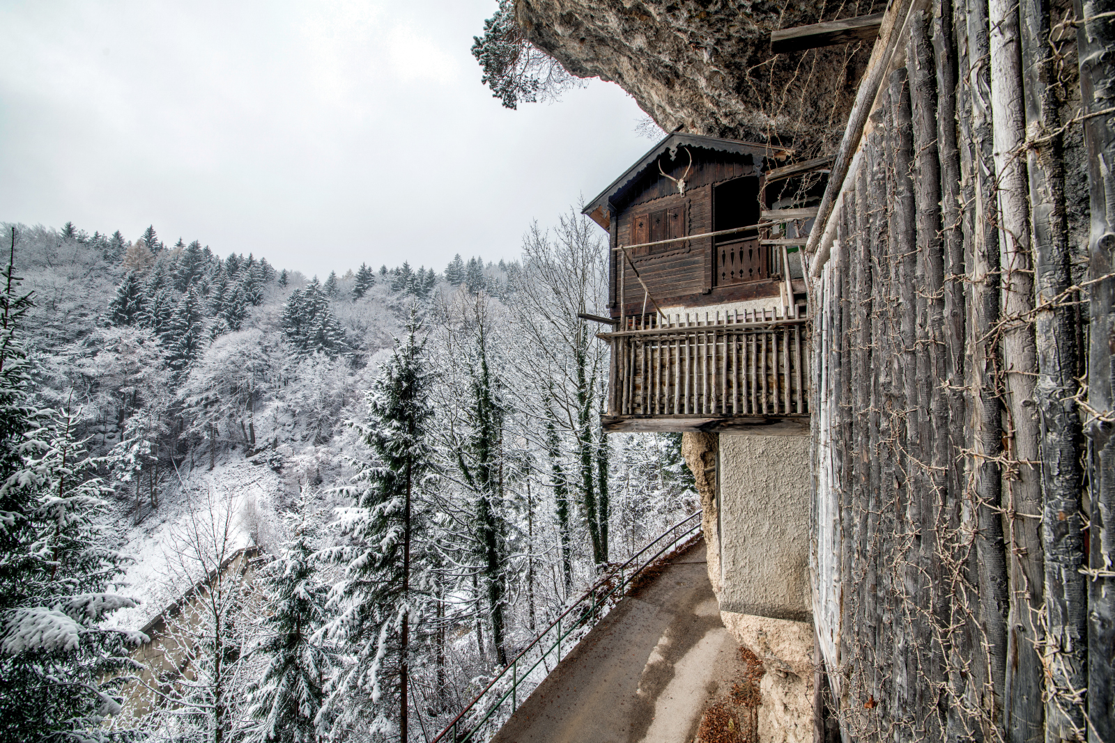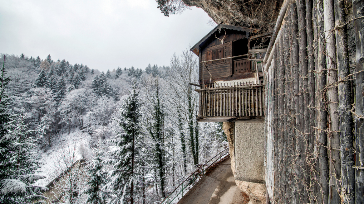 Oberhalb der Mühlauer Klamm befindet sich ein sehr hübsches Fotomotiv: eine Holzhütte, die in den Fels gebaut wurde und Teehütte genannt wird. Unweit der Teehütte findet man die Mühlauer Aussicht mit wunderschönem Blick auf Innsbruck und einem Bankerl zum Aussicht Genießen.
