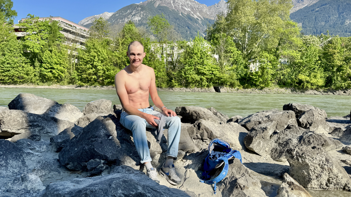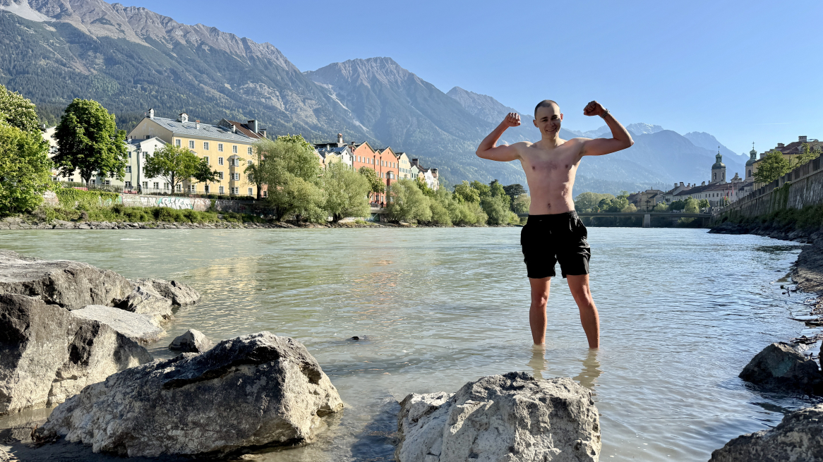 Acht Uhr morgens an einem Feiertag. Wir gehen Eisbaden. Zugegeben: Das war meine Idee. Ob er sich traut? Aber Samuel Tanner sagt ganz locker zu. Wohl einen Monat zuvor wollten wir uns treffen, erst Mountainbiken gehen, dann eine Runde Laufen, immer flog mir der junge Wahl-Innsbrucker im letzten Moment davon. Heute Vormittag hat er endlich Zeit, vielleicht zwei Stunden. Lächelnd spaziert er die paar Meter vom Marktplatz neben mir und nur ein paar Steinstiegen später funkelt der Inn auf Augenhöhe. Bei günstigem Wasserstand bremst eine Bucht die Strömung und liegt mit sandigem Ufer günstig für einen Badegang. Wir waten gemeinsam, erst hüfthoch, dann setzen, jetzt atmen und genießen. Vier Minuten Zwanzig: Wenn Tee länger zieht, wird er bitter. Um kein Risiko einzugehen, verlassen wir das Wasser. Frühstück? Samuel lächelt ohne ein Zittern. Ich bin beeindruckt. Wie oft er so Eisbaden geht, frage ich beim Anziehen beiläufig. Sein erstes Mal, lächelt er.