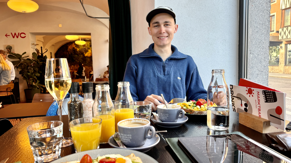 Guten Morgen sagt die Marktbar: Samuel bekommt Rührei auf Schwarzbrot, dazu Cappuccino und Orangensaft. Und das erste Mal Fliegen? Mit dem Vater, daheim im Drautal – antwortet er kauend. Von der Emberger Alm auf 1.750 Metern Seehöhe begleitete er den Vater auf unzählige Tandemflüge, bevor er mit 15 zum ersten Mal allein den Schirm hochzog. Hike & Fly wurde dem jungen Samuel also sogar ein bisschen mit ins Nest gelegt. Heute ist Samuel 26 Jahre jung, lebt und fliegt in Innsbruck - und studiert nebenbei ganz locker Medizin. Ein Beruf, der viel verlangt und Ausgleich braucht. Doch auch das Fliegen ist ein Freizeitkiller, gut 270 Stunden war er im letzten Jahr in er Luft. Ob er da oben eigentlich keine Angst hat, frage ich. Dort trägt er nur Verantwortung für sein eigenes Leben, das macht die Sache sehr viel leichter, sagt er sanft. Und wahrlich: Dieser Samuel strahlt eine stoische Stärke aus, steht fest im Leben, ein freundlicher, fliegender Fels.
