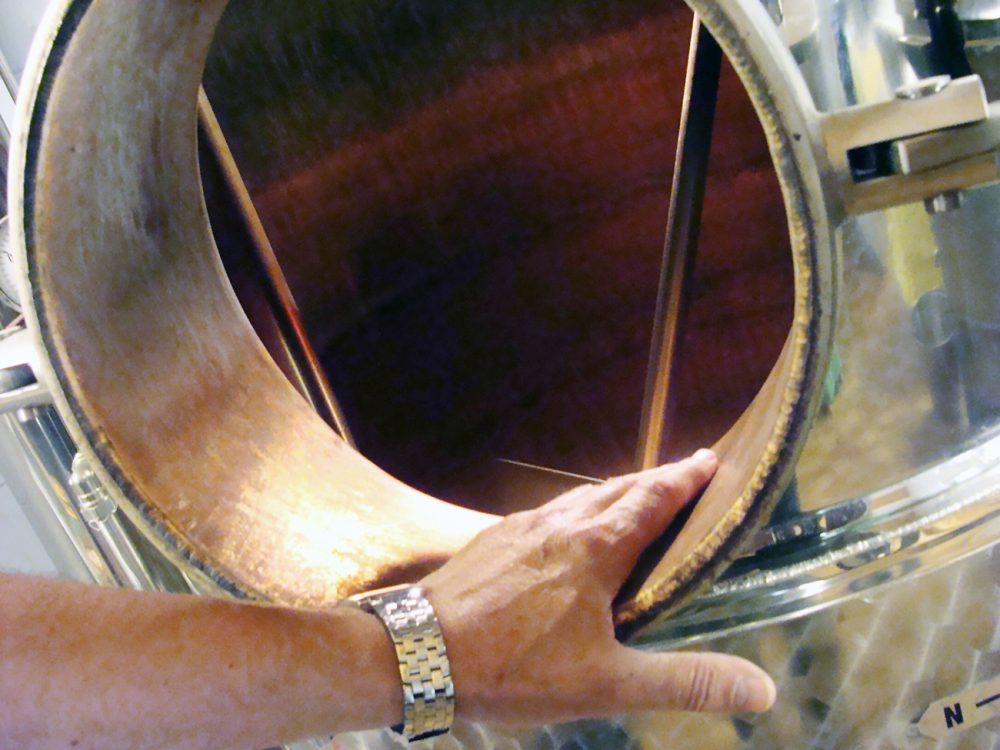 Respektvoll legt Reinhold seine Hand in den Kupferkessel, jener Ort, an dem die edelsten Destillate entstehen.