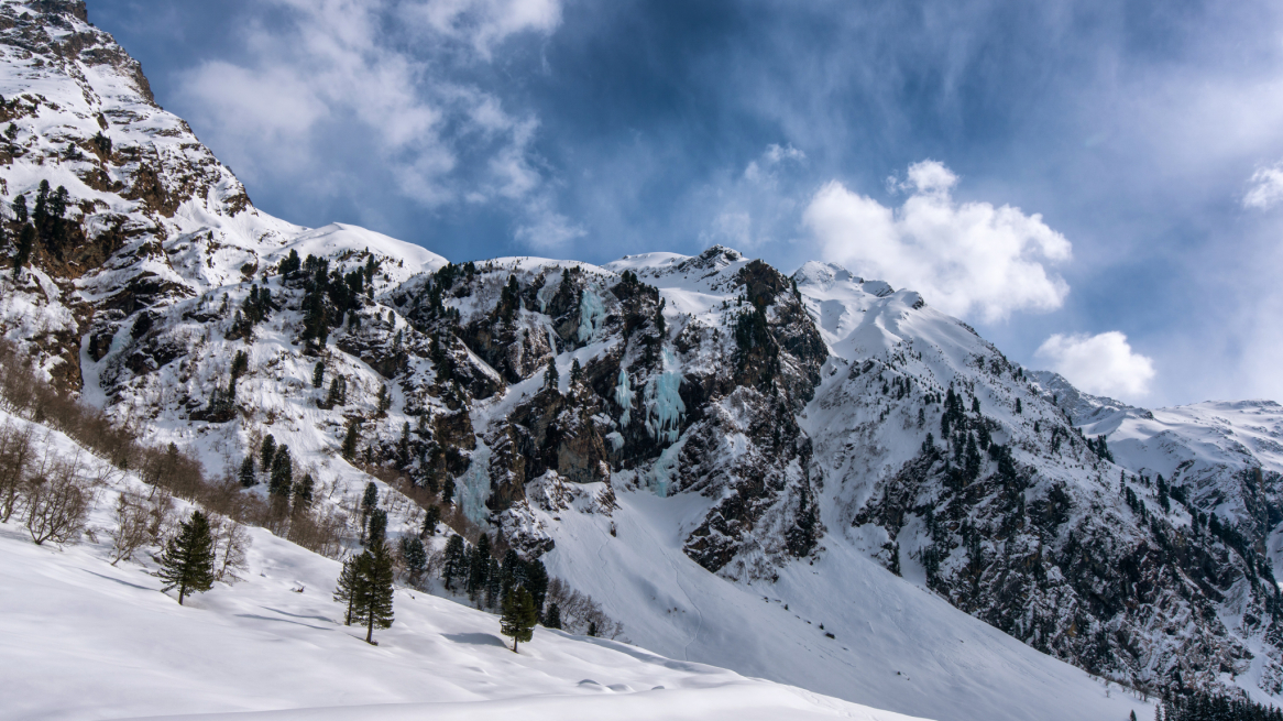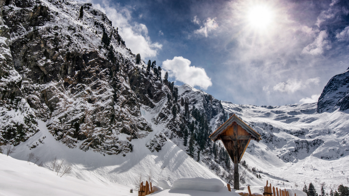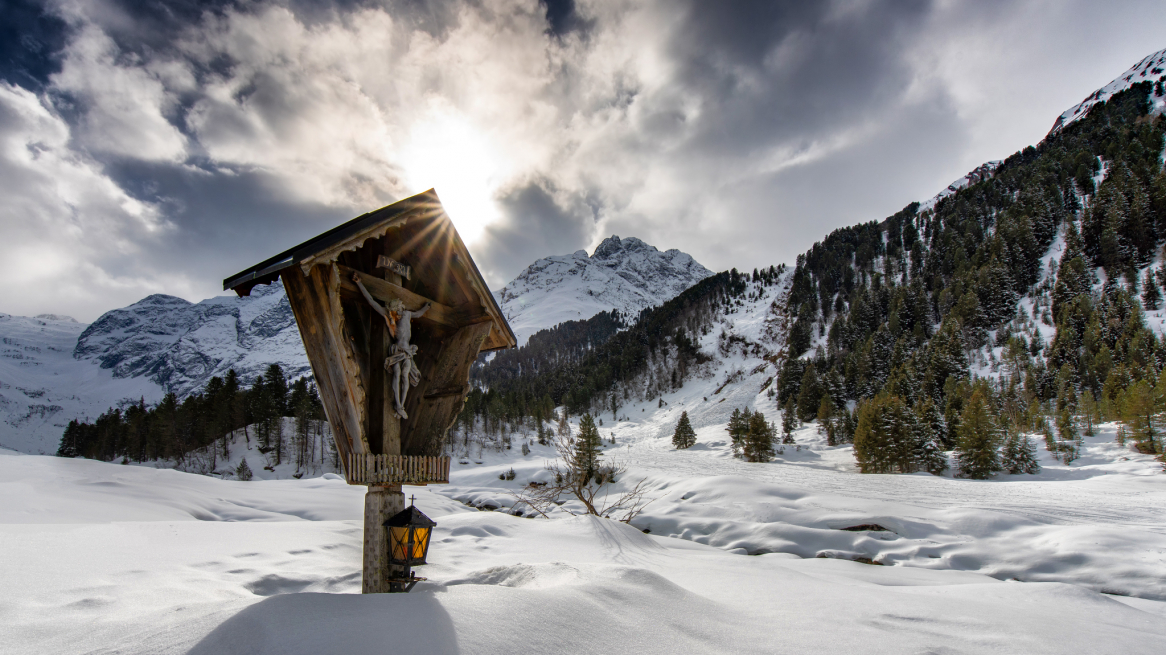 Ohne wirkliche Anstrengung führt der Wanderweg weiter hinein zum Fuß des Fernerkogels. Links und rechts bieten sich tolle Fotomotive der hochalpinen, schneereichen Kulisse. Auch einige große vereiste Wasserfälle findet man zwischen den schroffen Felsen. An der Materialseilbahn, die zum Westfalenhaus führt, gehen wir vorbei bis wir zu einem Marterl kommen, welches als sehr schönes Motiv mit dem Lüsener Fernerkogel abgelichtet werden kann. Die Wanderung führt dann noch weiter zu einer Hütte, einem Jugendheim. Dort kann man kurz rasten und dann den gleichen Weg wieder retour gehen. Der Winterwanderweg kann im Sommer auch als Gletscherpfad besucht werden. Die Tafeln dazu sind jedoch aufgrund des vielen Schnees im Winter kaum sichtbar.
