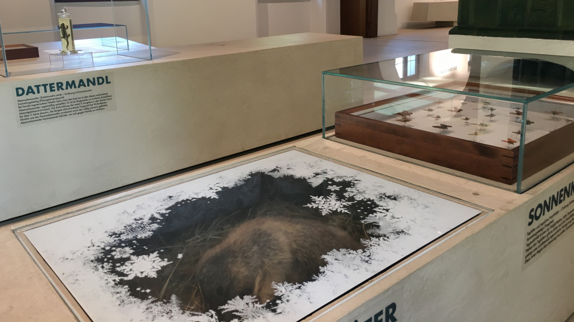 Wie können Tiere und Pflanzen im Hochgebirge überleben? Die klimatischen Bedingungen in diesen Höhenlagen sind extrem: große Temperaturschwankungen, Wind, Eis und kurze "Sommer". Dennoch gibt es zahlreiche Arten, die sich an diesen Lebensraum angepasst haben und dabei einige raffinierte Tricks anwenden. Das Alpenmurmeltier zum Beispiel hat sich für den Winterschlaf entschieden. In der Ausstellung sehen wir ein Präparat eines Murmeltiers in seinem Bau. Dort verbringt er zwischen 6 und 7 Monaten schlafend. Die Lebensfunktionen verlangsamen sich: 2 Atemzüge und 20 Herzschläge pro Minute. Dadurch wird der Energieverbrauch gesenkt und das Tier kann mit den im Sommer angesammelten Fettreserven überleben.