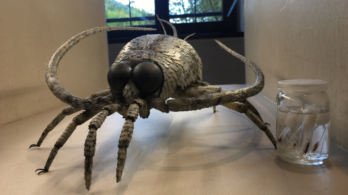 Die Machilidae ist ein 50 Millionen Jahre altes Insekt, das in großer Höhe lebt. In einer Vitrine können wir einige Exemplare davon in Reagenzgläsern sehen, aber ein vergrößertes Modell erlaubt es uns, alle Details zu betrachten und ihm direkt in die Augen zu sehen.