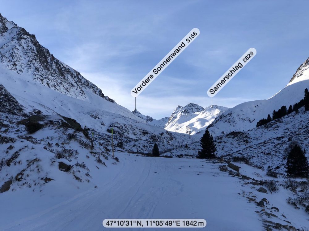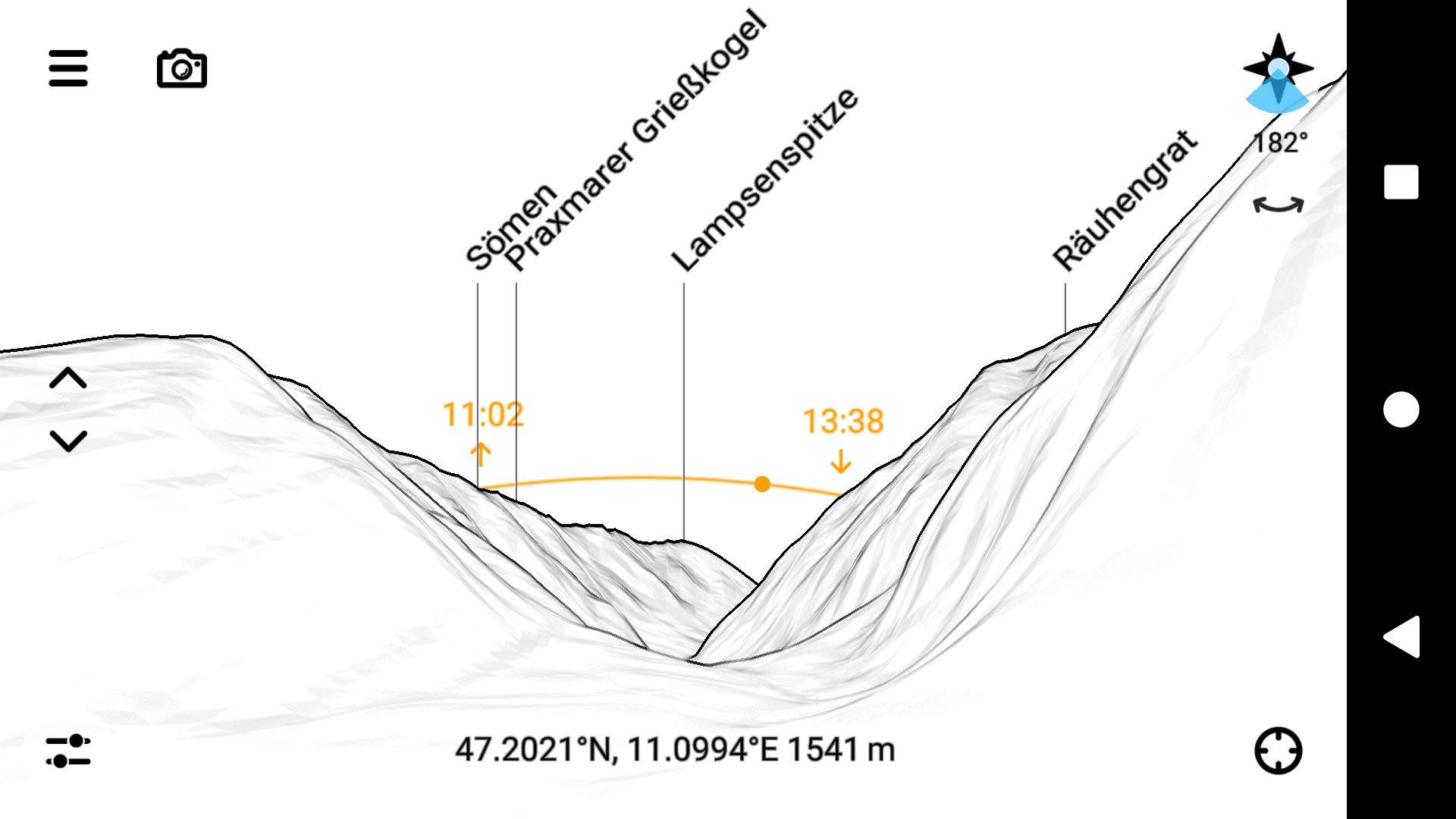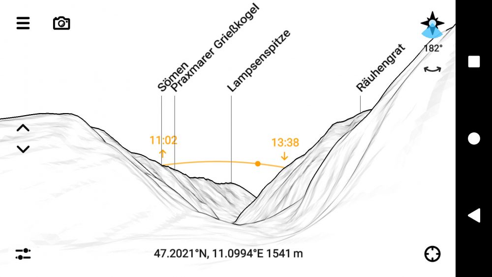 Die einzige App in dieser Sammlung die nicht gratis ist. 4,69€ kostet sie Anfang 2019. Für Bergfexe kann ich versprechen: Jeden Cent wert! Der PeakFinder zeigt in einem 3D Modell alle – wirklich alle – Gipfel mit Höhe und Bezeichnung um den eigenen Standpunkt und darüber hinaus zuverlässig in ganz Tirol an. Man kann mit einer Vielzahl an Spielereien die Zeit verbringen und ich tue es jedes Mal sehr gern. Die App berechnet für jeden Standort den Sonnenbogen an jedem Tag im Jahr mit Aufgangs- & Untergangszeitpunkt sowie -ort. Wann geht die Sonne auf diesem oder jenen Gipfel auf? Wird sie von einem Nachbargipfel verdeckt? Alles spielerisch leicht mit dem PeakFinder herauszufinden.