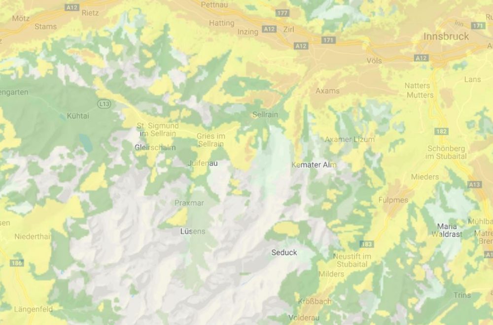 Netzabdeckung eines großen Mobilfunkanbieters zwischen Kühtai und Innsbruck. Die Farben zeigen die Verbindungsgeschwindigkeit. Die Sellraintaler Seitentäler sind teilweise bis weit über die Hälfte komplett ohne Handy-Empfang. Damit kann man auch keinen Notruf absetzen und muss um Hilfe zu holen bis zum nächsten Empfangspunkt auf- oder absteigen.