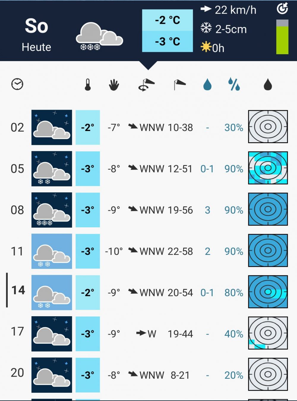 Meteoblue ist meiner Einschätzung nach unter den Apps am besten geeignet für die Wetterprognose im Gebirge. Ich schaue dort aber immer über die mobile Seite rein, die für mich der zugehörigen App um nichts nachsteht. Am besten schaut man sich aber nach wie vor die menschlich überarbeiteten Vorhersagen der ZAMG (Vorhersage Tirol, Bergwetter Tirol) oder des ORF an.