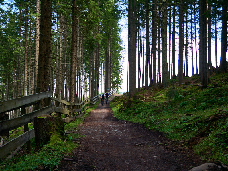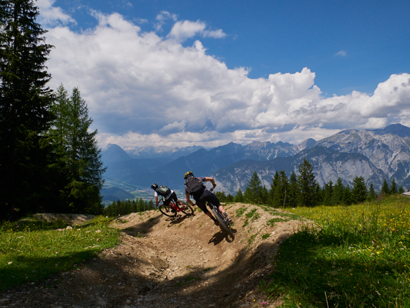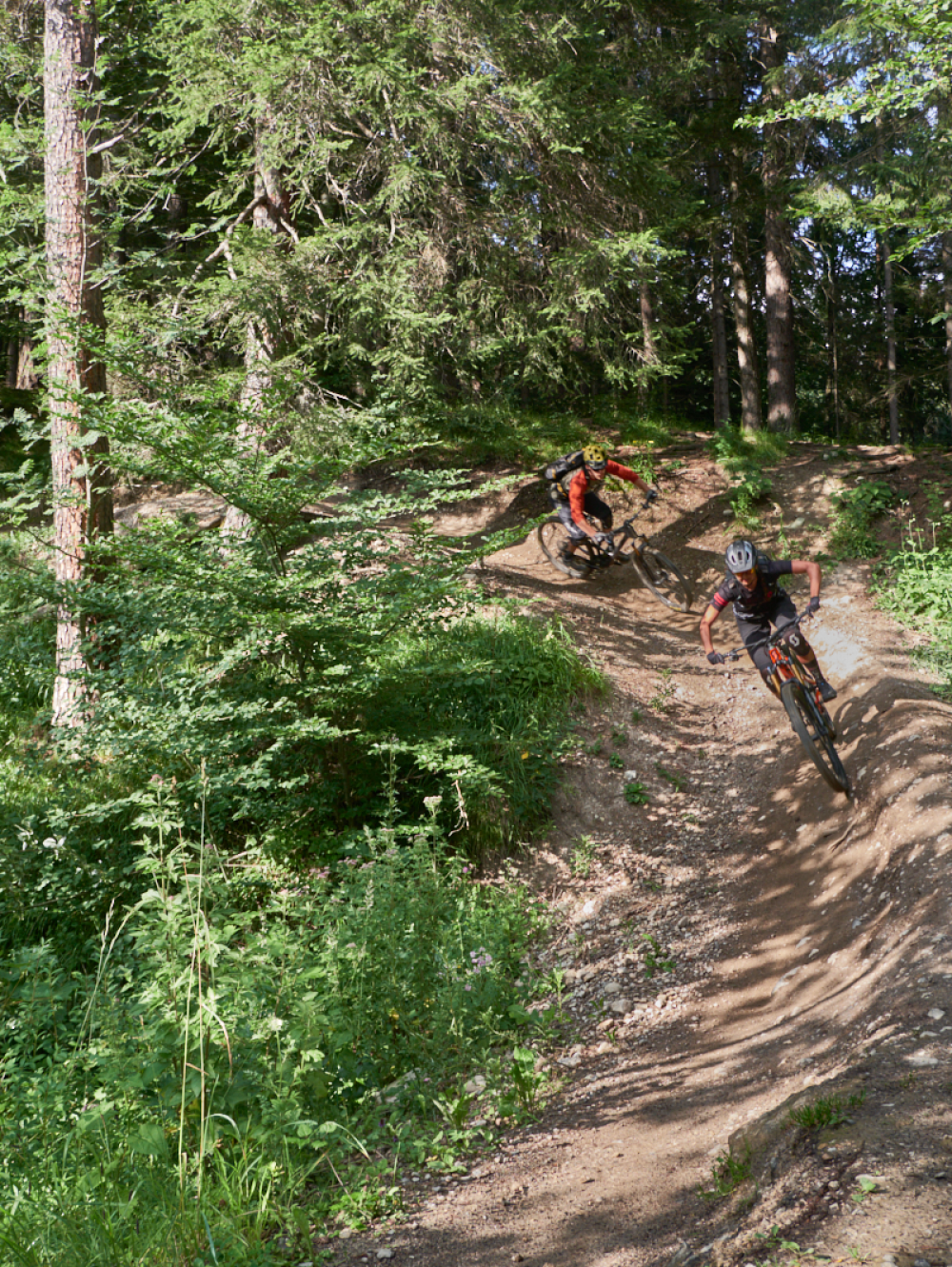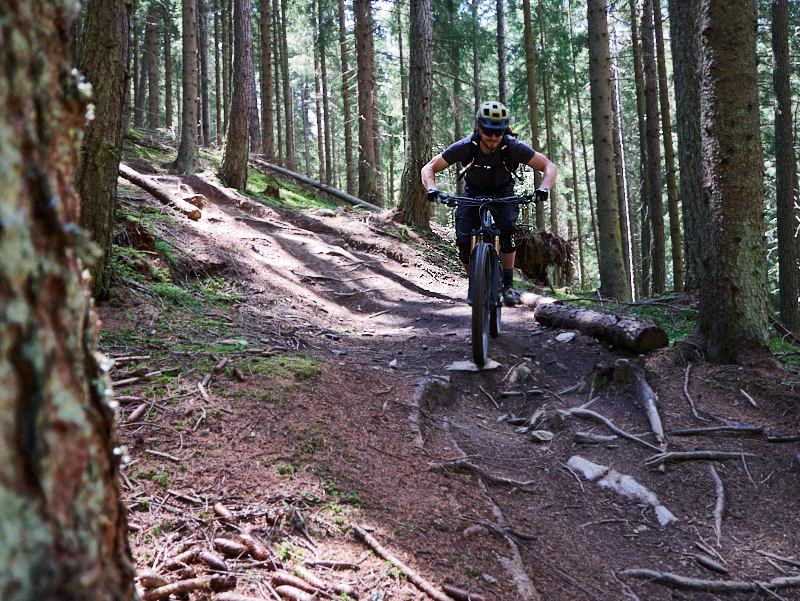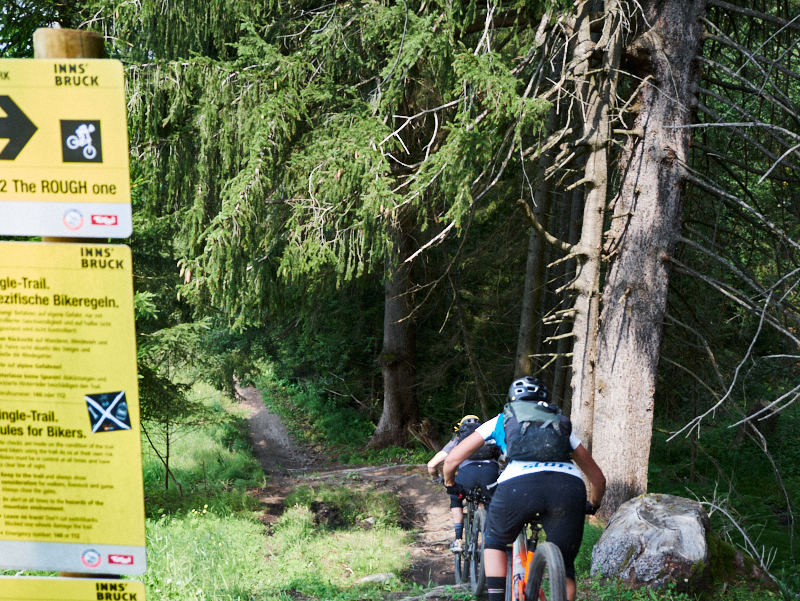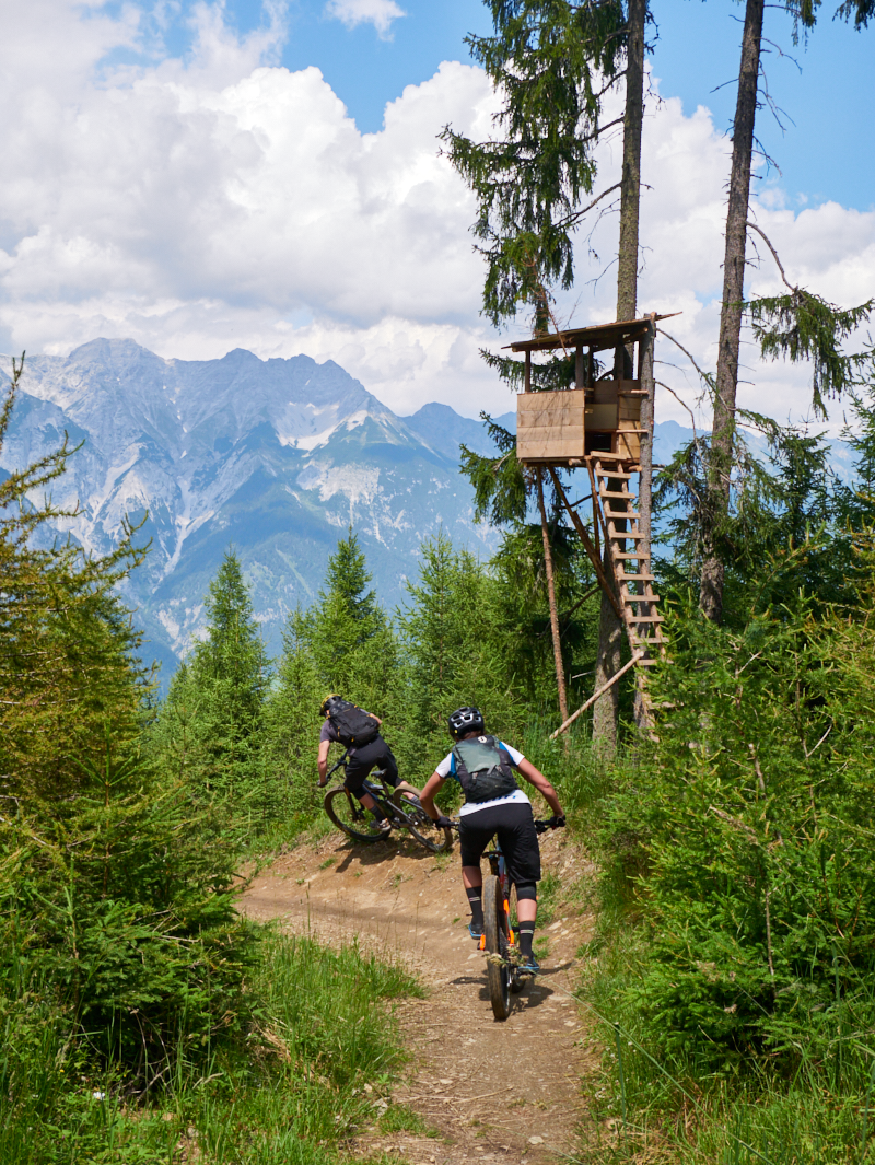 Mit aufgeladenen Batterien (nicht falsch verstehen, Bio-Bike, kein E!) strampeln wir noch ein paar Höhenmeter auf dem Forstweg bergauf. Hier gäbe es weiter oben auch die Option auf den Nordkette Singletrail einzusteigen, der ist jedoch momentan geschlossen. Daher queren wir direkt hinüber zum Arzler Alm Trail, wo wir die letzte Abfahrt des Tages genießen. Auf unserem Hometrail kennen wir natürlich jede Wurzel, was dem Spaß keinen Abbruch tut – ganz im Gegenteil! Der AAT, wie wir Locals den Arzler Alm Trail nennen, ist eine perfekte Symbiose aus flowigen und ruppigen Passagen, kleinen und größeren Sprüngen und Anliegern – so wie wir es am liebsten mögen!