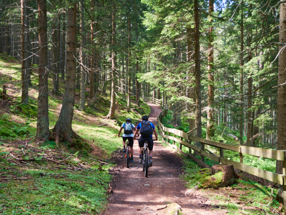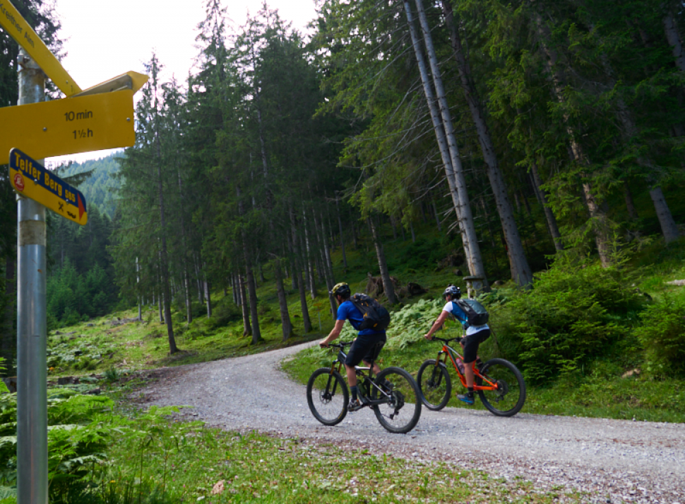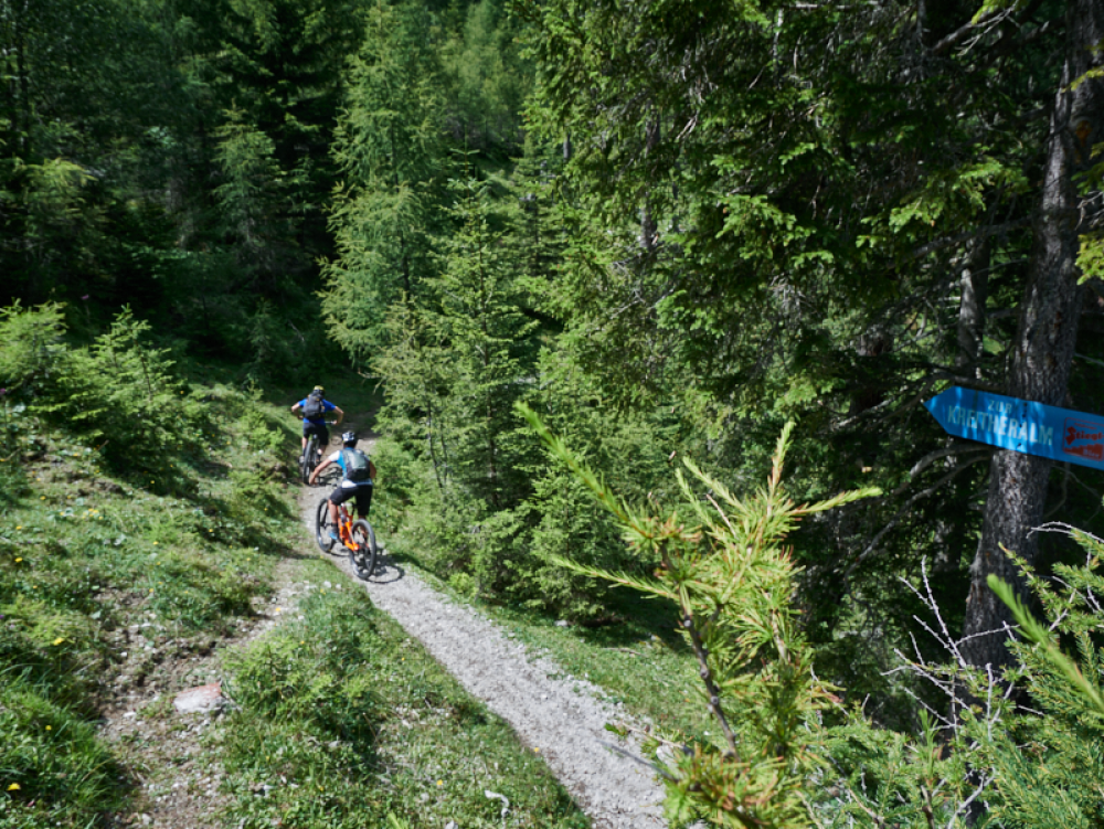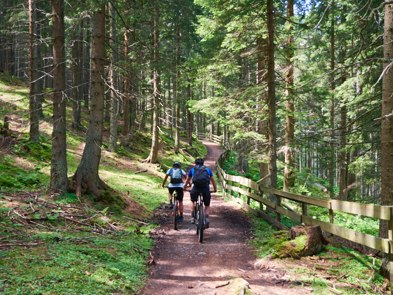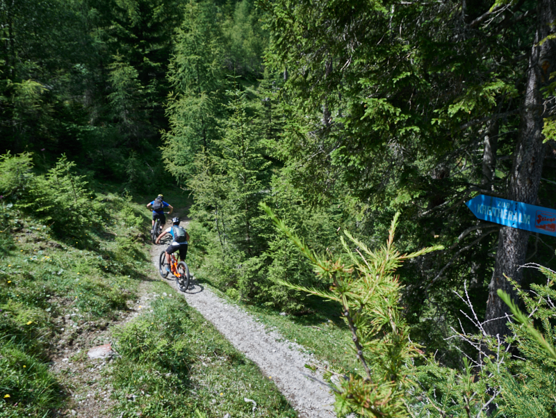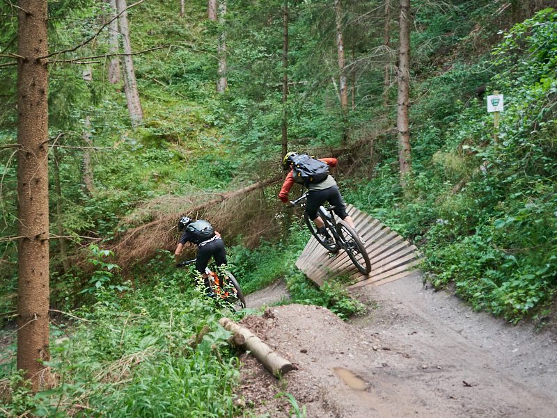Mit aufgeladenen Batterien (nicht falsch verstehen, Bio-Bike, kein E!) strampeln wir noch ein paar Höhenmeter auf dem Forstweg bergauf. Hier gäbe es weiter oben auch die Option auf den Nordkette Singletrail einzusteigen, der ist jedoch momentan geschlossen. Daher queren wir direkt hinüber zum Arzler Alm Trail, wo wir die letzte Abfahrt des Tages genießen. Auf unserem Hometrail kennen wir natürlich jede Wurzel, was dem Spaß keinen Abbruch tut – ganz im Gegenteil! Der AAT, wie wir Locals den Arzler Alm Trail nennen, ist eine perfekte Symbiose aus flowigen und ruppigen Passagen, kleinen und größeren Sprüngen und Anliegern – so wie wir es am liebsten mögen!