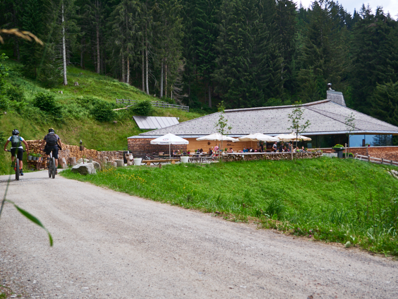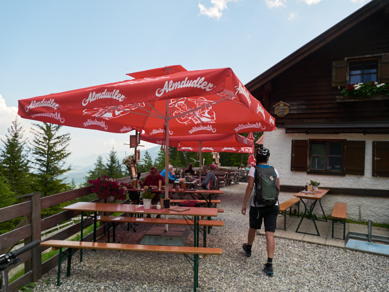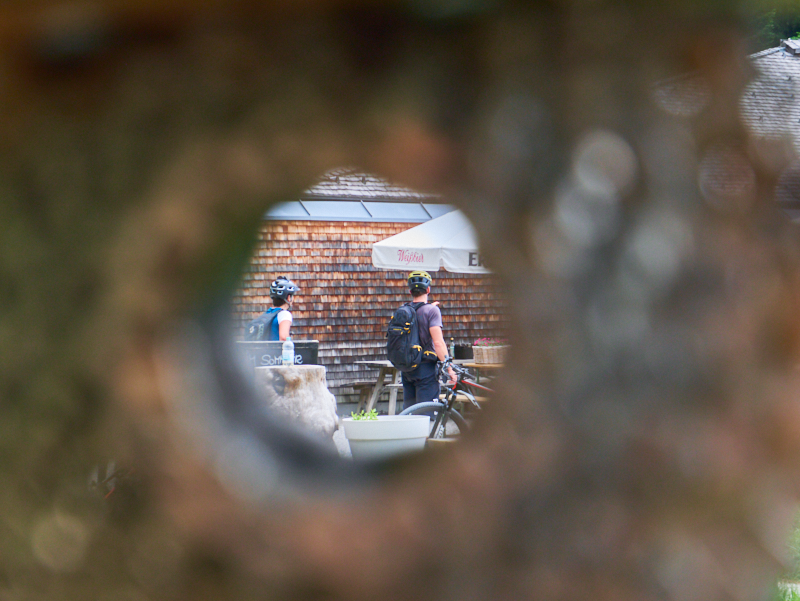 Nach der langen Abfahrt geht’s einmal quer durch Innsbruck, und auf der gegenüberliegenden Talseite auch schon wieder bergauf. Über das Höttinger Bild schlängeln wir uns in etwas gemäßigterem Tempo den Forstweg die Nordkette hinauf. Zugegebenermaßen: mit den Gedanken schon bei der nächsten Einkehr.