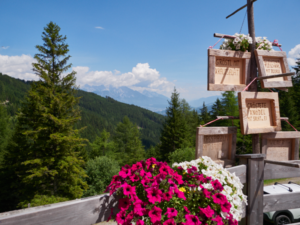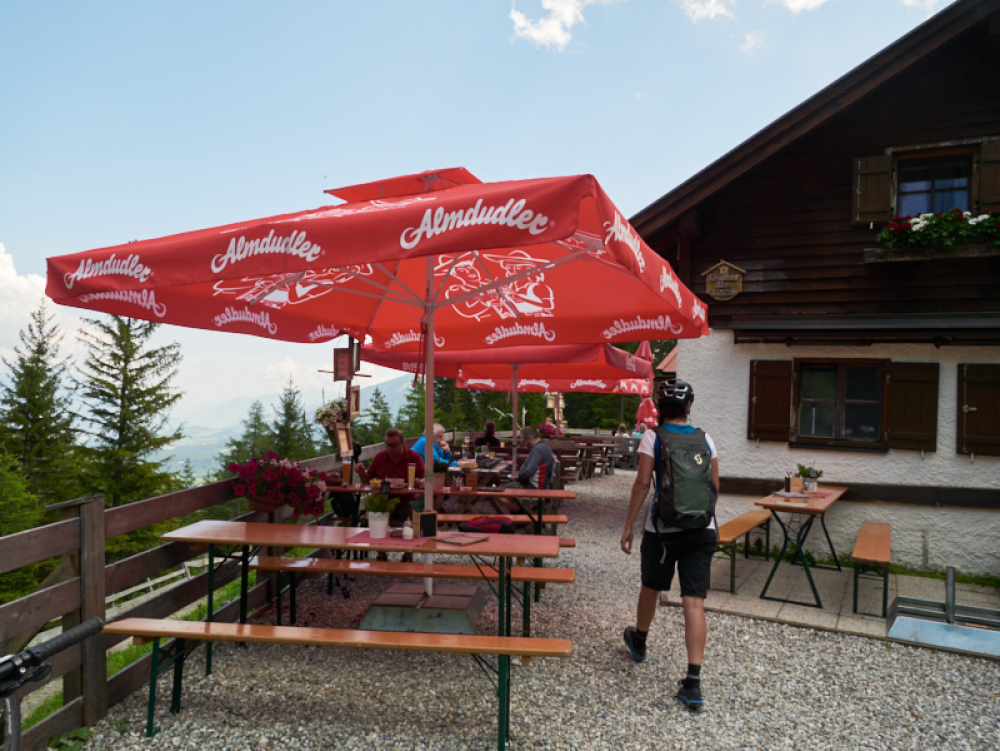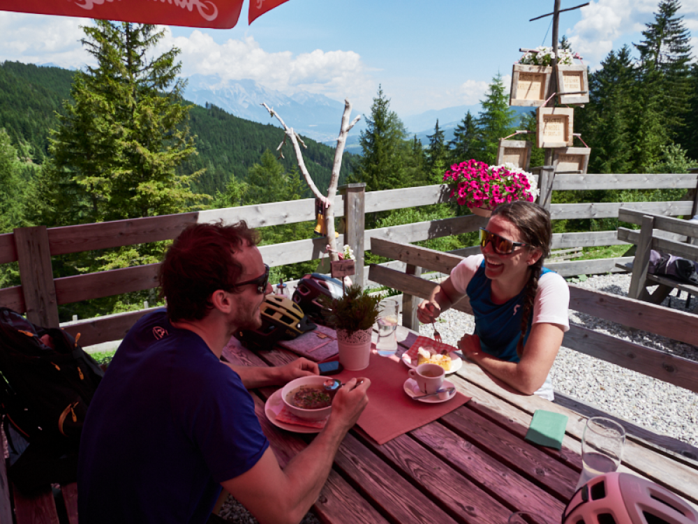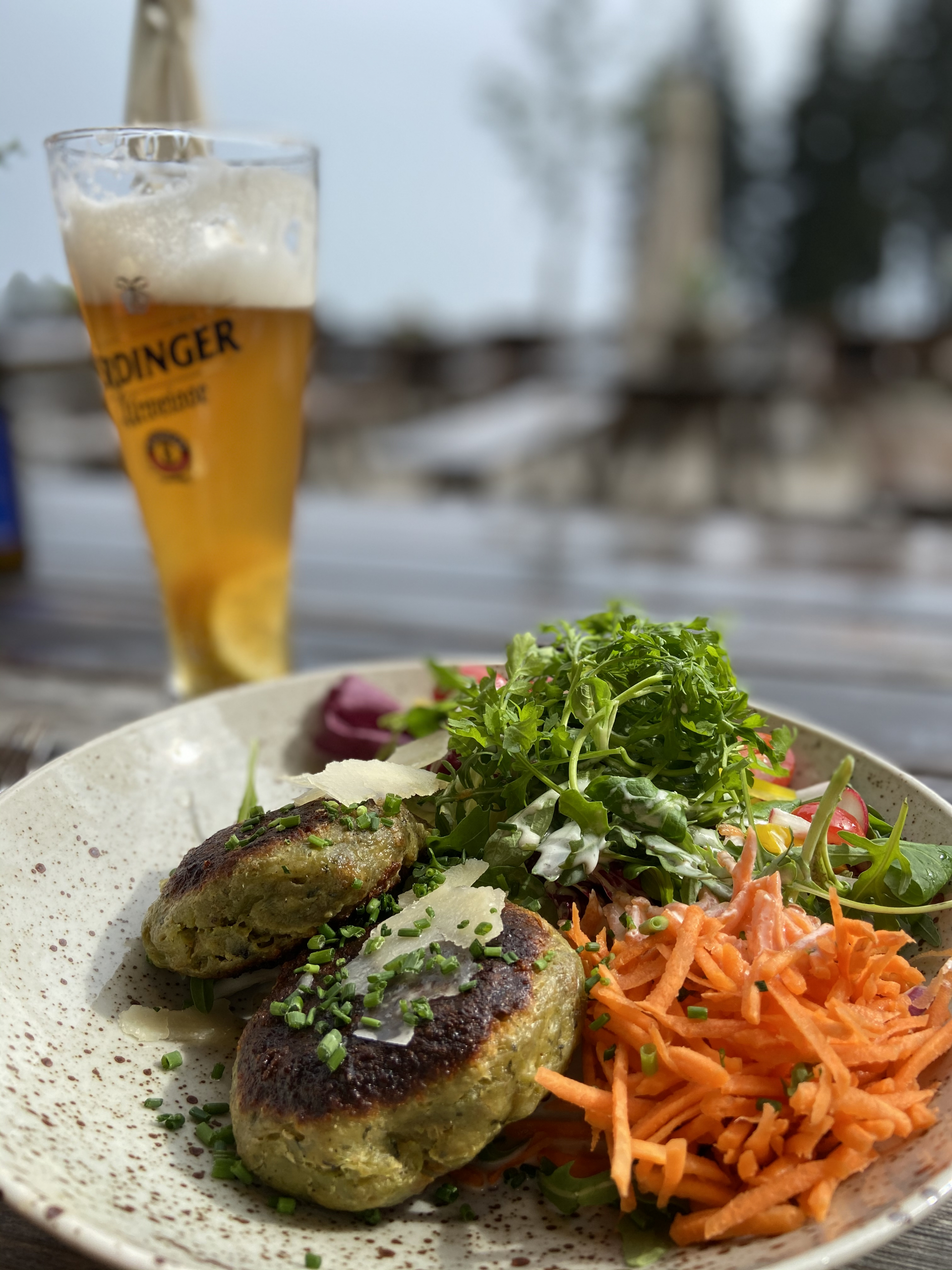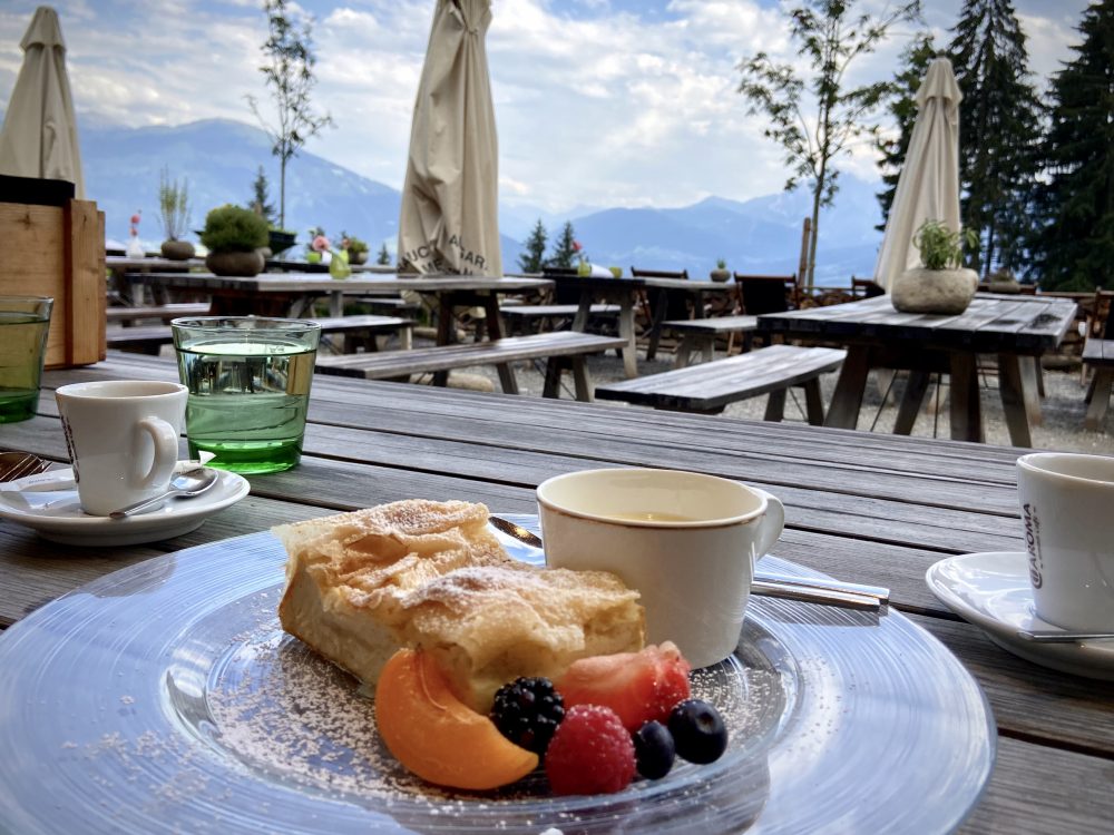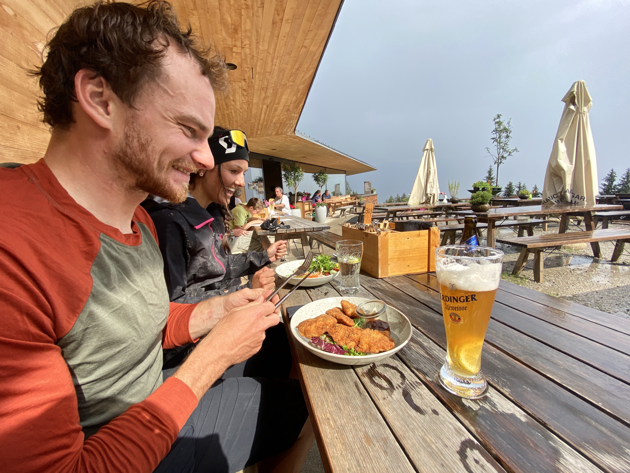 Ein paar Minuten nachdem wir die Umbrüggler Alm erreichen, sorgt ein Sommergewitter für Abkühlung von Außen – und das Weißbier von Innen. Gut geschützt auf der gemütlichen Terrasse der Alm, beobachten wir das Wetterspektakel und überzeugen uns selbst vom guten Ruf der Küche. Wir sind uns sicher, nicht nur der sich ankündigende Hungerast ist Schuld an unserer Begeisterung für das Essen auf der Umbrüggler. Die Kaspressknödel und der Backhendlsalat sind wirklich phänomenal! Und wenn du denkst, es geht nicht besser… kommt von irgendwo ein Traum von Topfenstrudel mit Vanillesauce und frischen Beeren daher. Die Sonne hatte sich mittlerweile auch schon wieder gegen das kurzweilige Gewitter durchgesetzt und so sind wir bereit für die letzte Etappe unserer Tour.