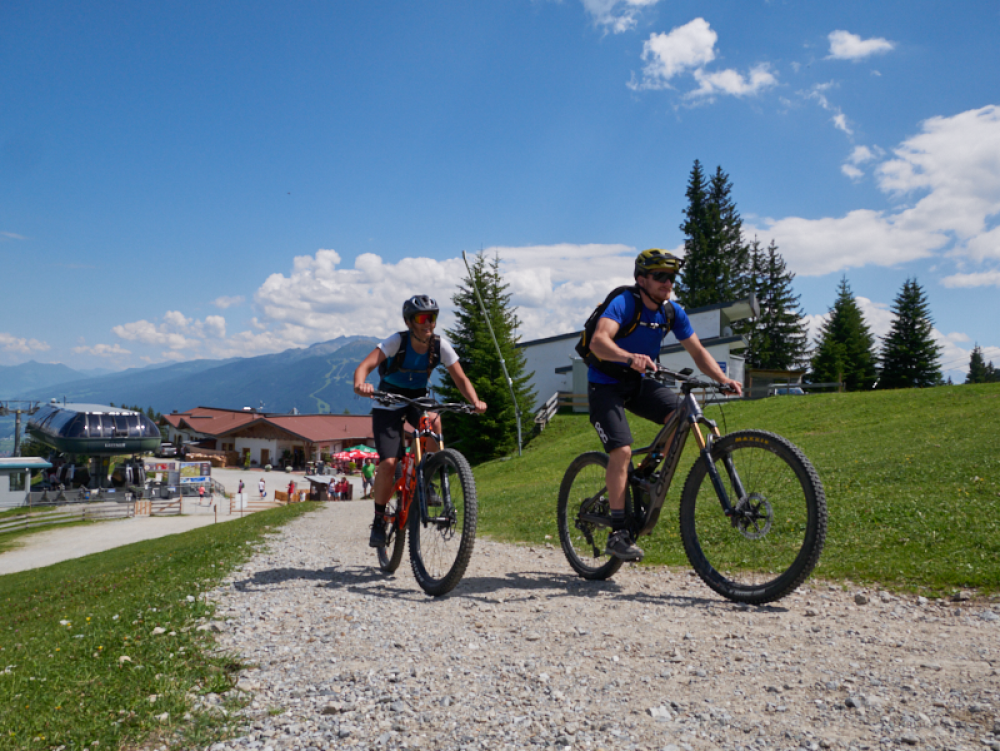 Nach einem kurzen Stich von der Bergstation der Mutterer Alm hinauf zum Speicherteich ziehen wir uns zum ersten Mal unsere Knieprotektoren an. Vorfreude!