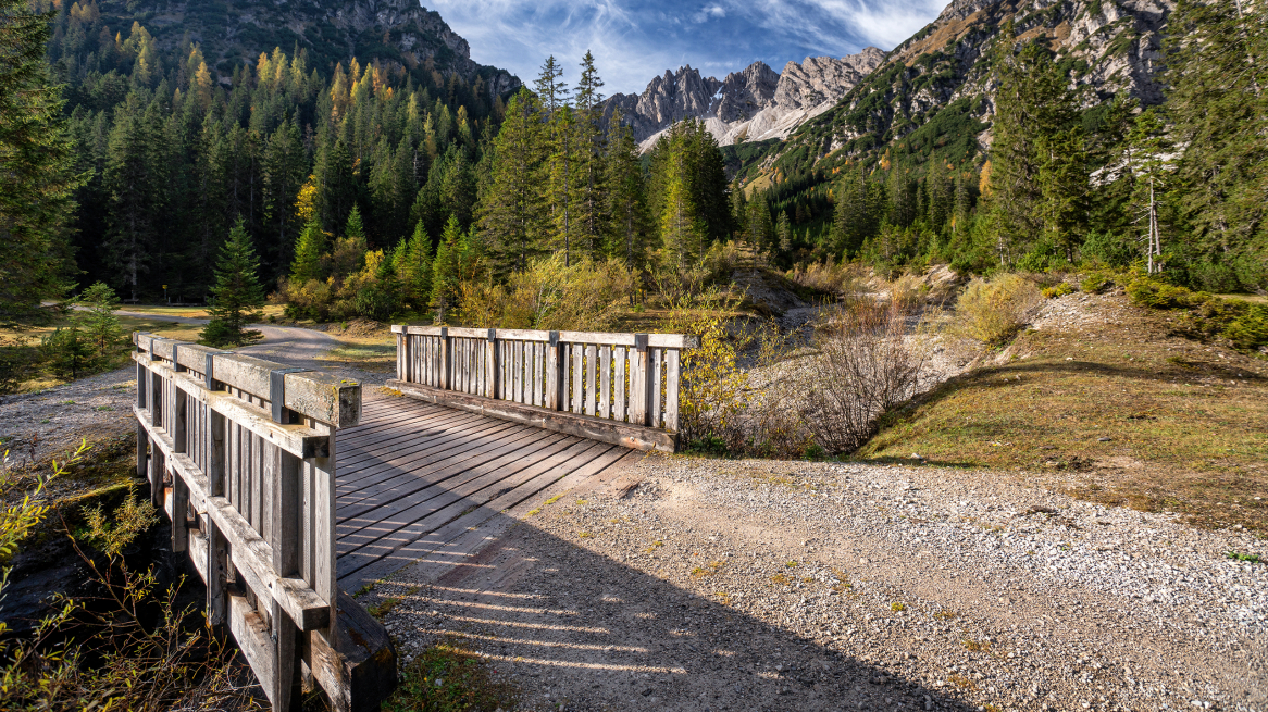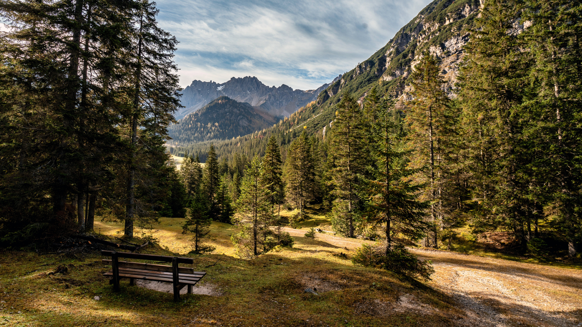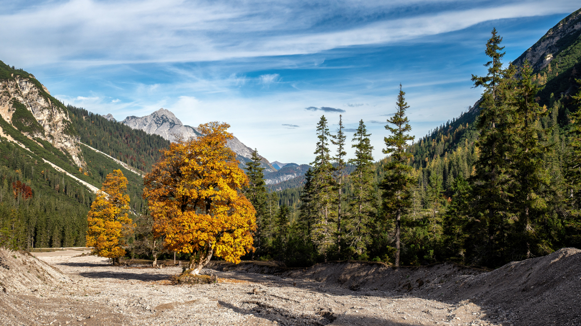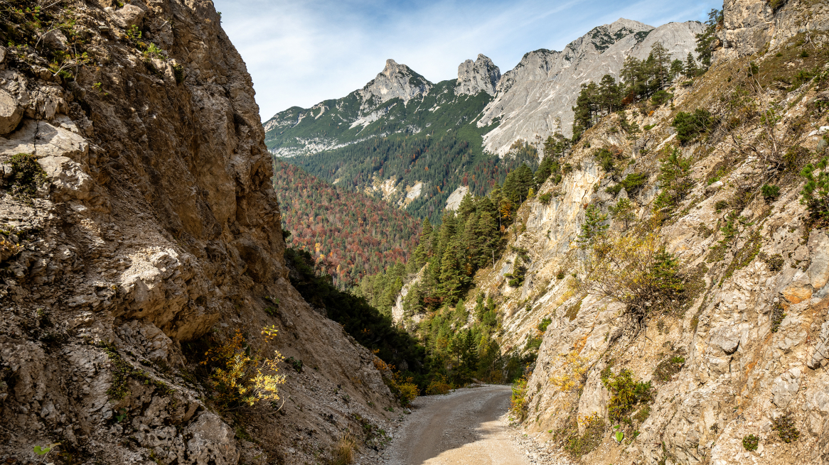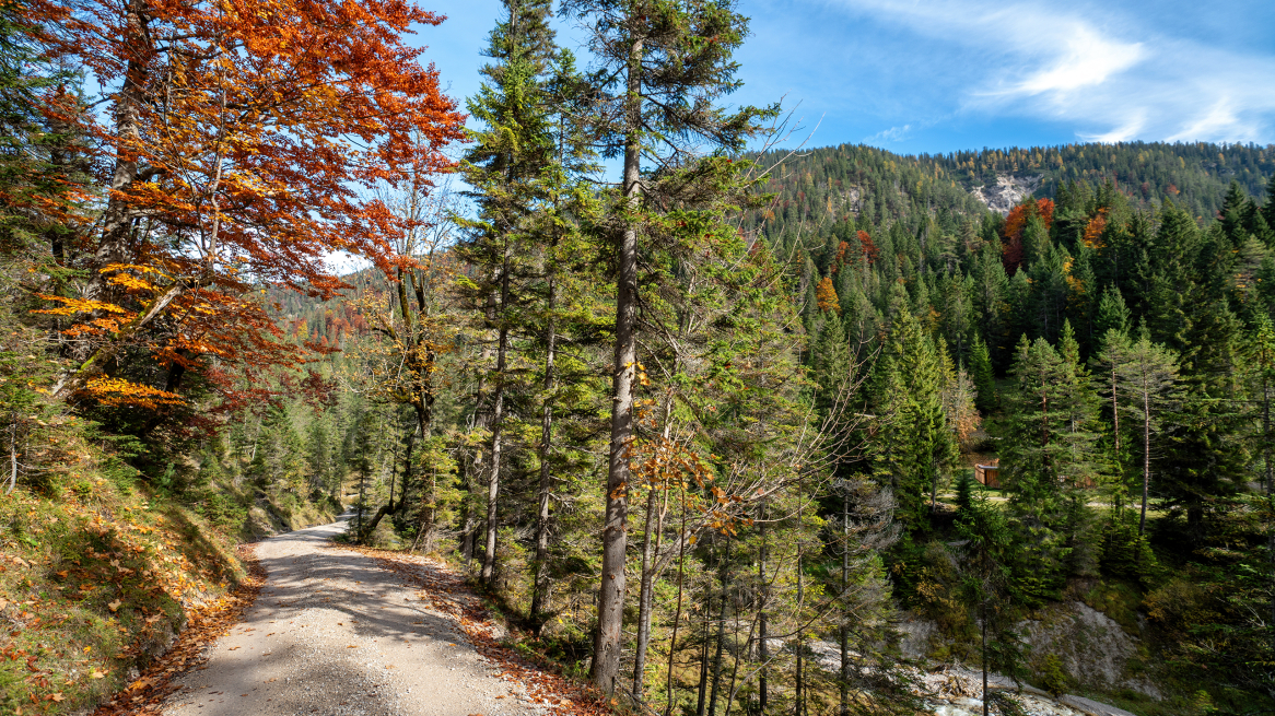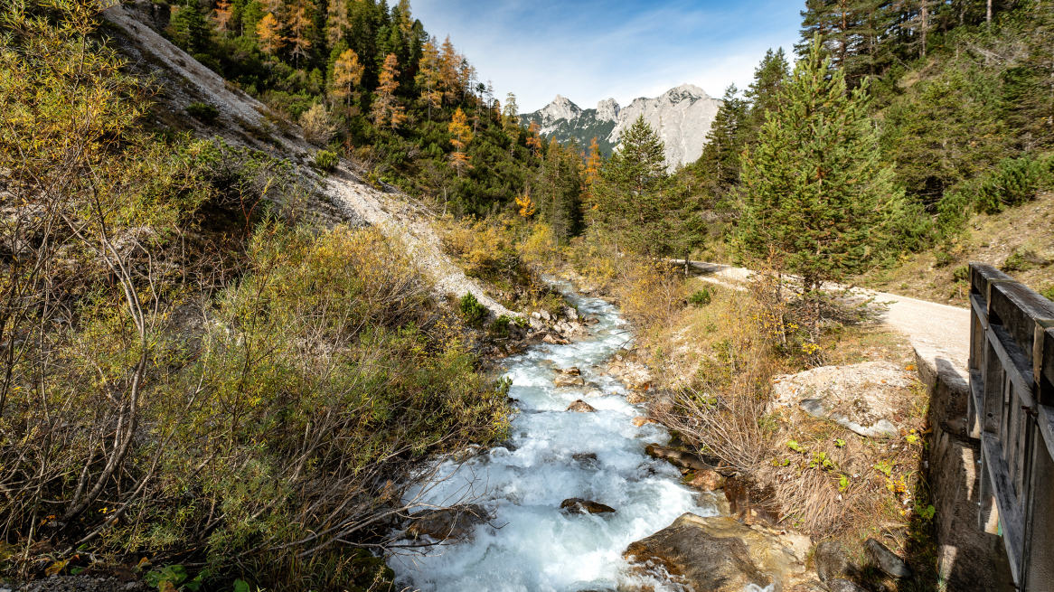 Die Wanderung beginnt im kleinen Ort Gießenbach, gleich direkt am Bahnhof. Schon kurz nach dem Start taucht man in das beeindruckende Karwendelgebirge ein, das für seine wilden, unberührten Landschaften berühmt ist. Der Weg führt entlang des Gießenbachs und durch herbstlich gefärbte Wälder, die in der tief stehenden Sonne in warmen Gelb- und Rottönen leuchten. Am Anfang der Wanderung windet sich der Gießenbach schluchtartig und beeindruckend hinaus ins Tal.