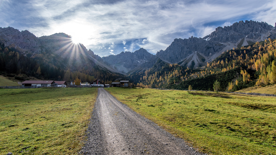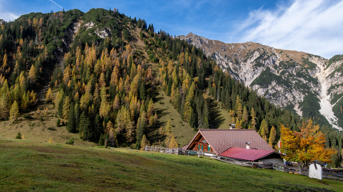 Von der Alm aus hat man einen weiten Blick über die umliegenden Gipfel, darunter den imposanten Großen Solstein. Bei schönem Wetter taucht die tief stehende Herbstsonne den Talkessel in ein warmes Licht, das die Szenerie besonders fotogen macht. Die bunten Lärchen erstrahlen dabei in ganz besonderem Glanz.