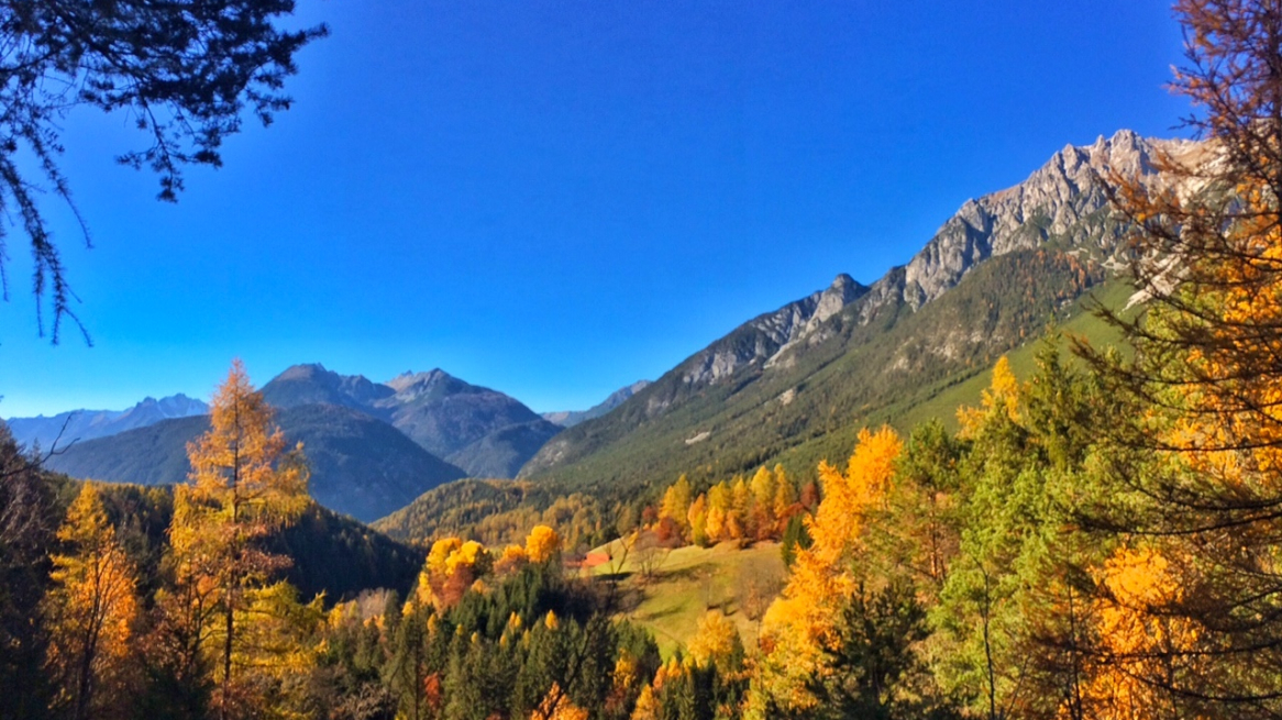 Ab dem verträumt gelegenen Weiler Weisland eröffnen sich nun die spektakulärsten Ausblicke der Wanderung. Einerseits auf die Berge der Stubaitaler Alpen, die sich südlich des Inntales erheben. Andererseits das Gold der Lärchenwälder, das von nun an die Aussicht beherrscht. Bei schönem Wetter bilden sie einen faszinierenden Kontrast zum tiefblauen Himmel. Übrigens: Das Plateau beim Arzkasten ist im Winter ein fantastisches und sehr beliebtes Ski-Langlaufgebiet.