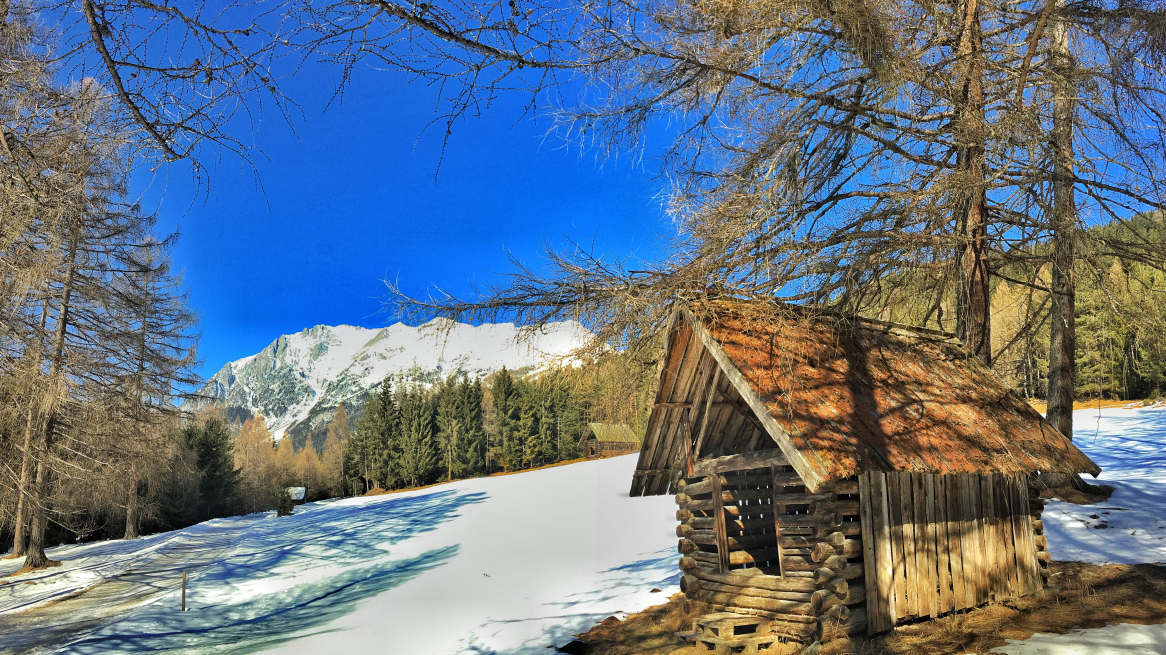 Die Heupille im Winter vor den 'kahlen' Lärchen. Der Weg wird zu einer wunderbaren Naturrodelstrecke. ©W. Kräutler