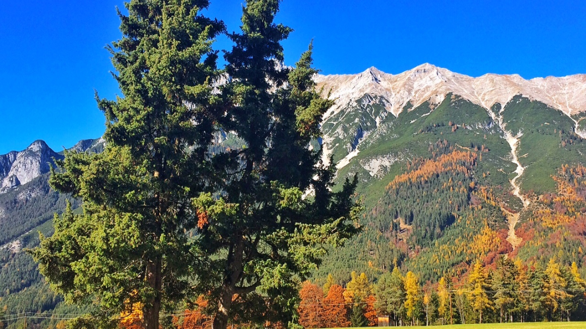Es ist, als wollte sich die Natur noch einmal zu einem letzten grandiosen Höhepunkt aufschwingen. Am Fuß der majestätischen Mieminger Kette veranstalten die Lärchen zwischen dem Holzleitensattel und Affenhausen für kurze Zeit ein einzigartiges Schauspiel, bevor sie die Nadeln fallen lassen und der schwarz-weiße Winter Einzug hält.
