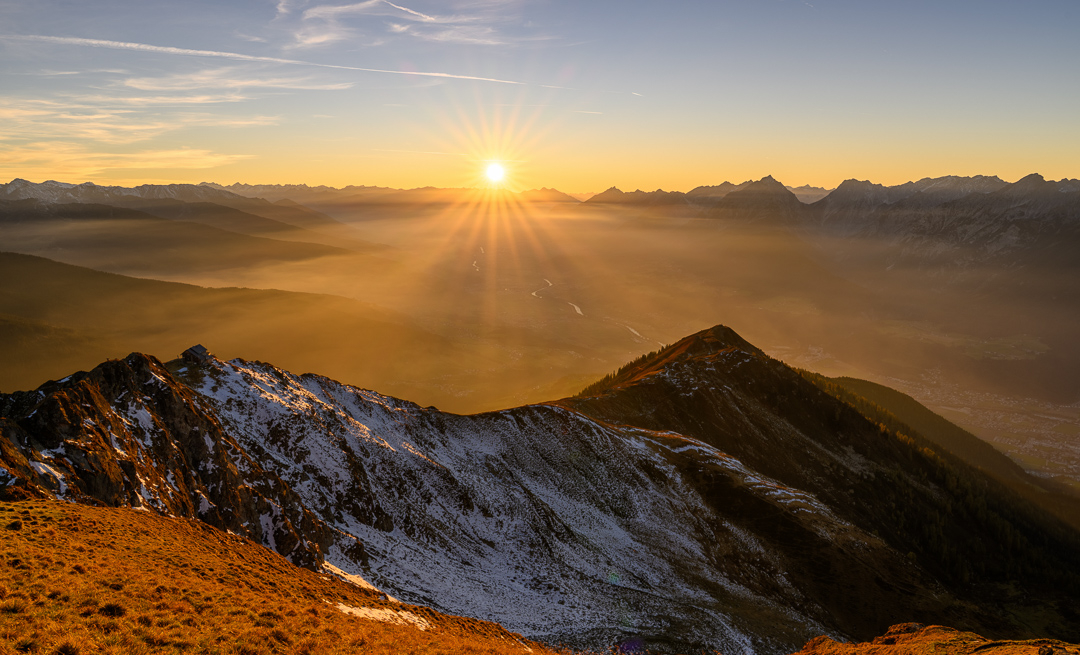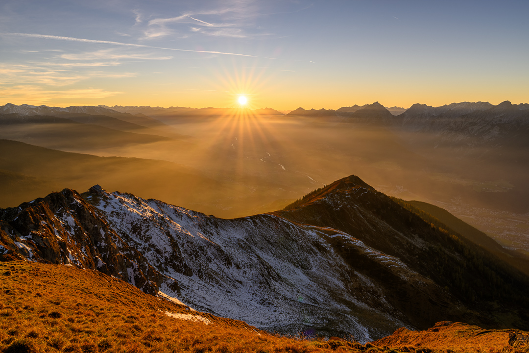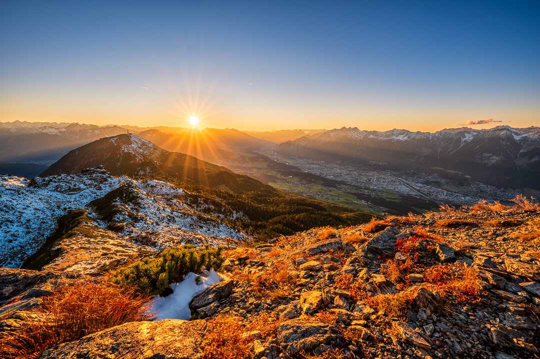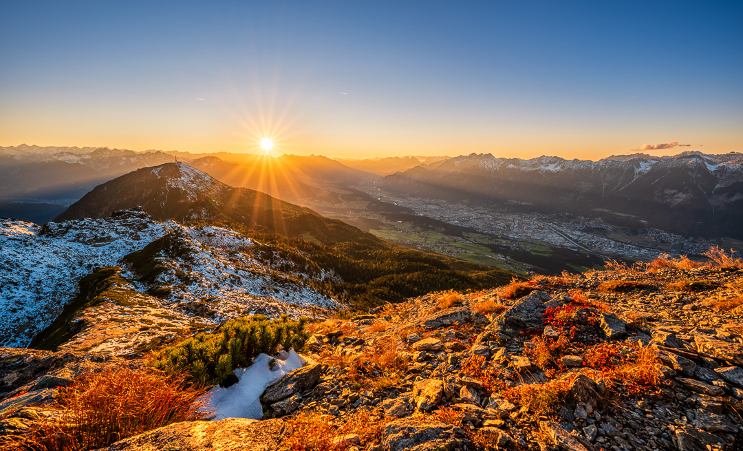Auch in den Bergen rund um Innsbruck zeigt sich der Herbst von seiner schönsten Seite. Die Stimmung dort oben ist zu dieser Jahreszeit besonders eindrucksvoll, wenn sich der Nebel sanft über die Täler legt, die Wälder in warmen Rot und Goldtönen leuchten und die Sonne die Gipfel in ein sanftes Licht taucht. Die klaren, frischen Bergwinde tragen den Duft von feuchtem Laub und harzigem Nadelholz, während die Aussichtspunkte atemberaubende Panoramen auf das Inntal und die umliegenden Alpen bieten. Besonders im Spätherbst kann man auch weiter oben schon mit den ersten Schneefällen rechnen, die die Landschaft in eine noch malerischere, fast märchenhafte Stimmung tauchen.