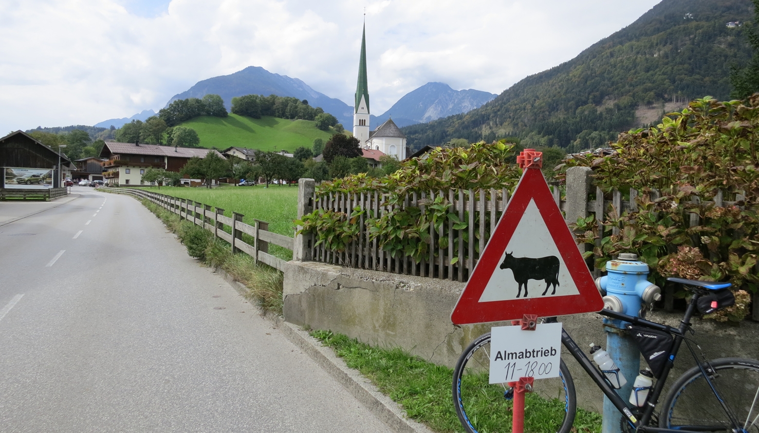 Für mich ungewohnt, hier in Wiesing ganz normal: Warnung vor tierischem Straßenverkehr!