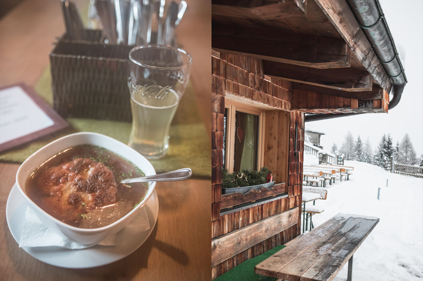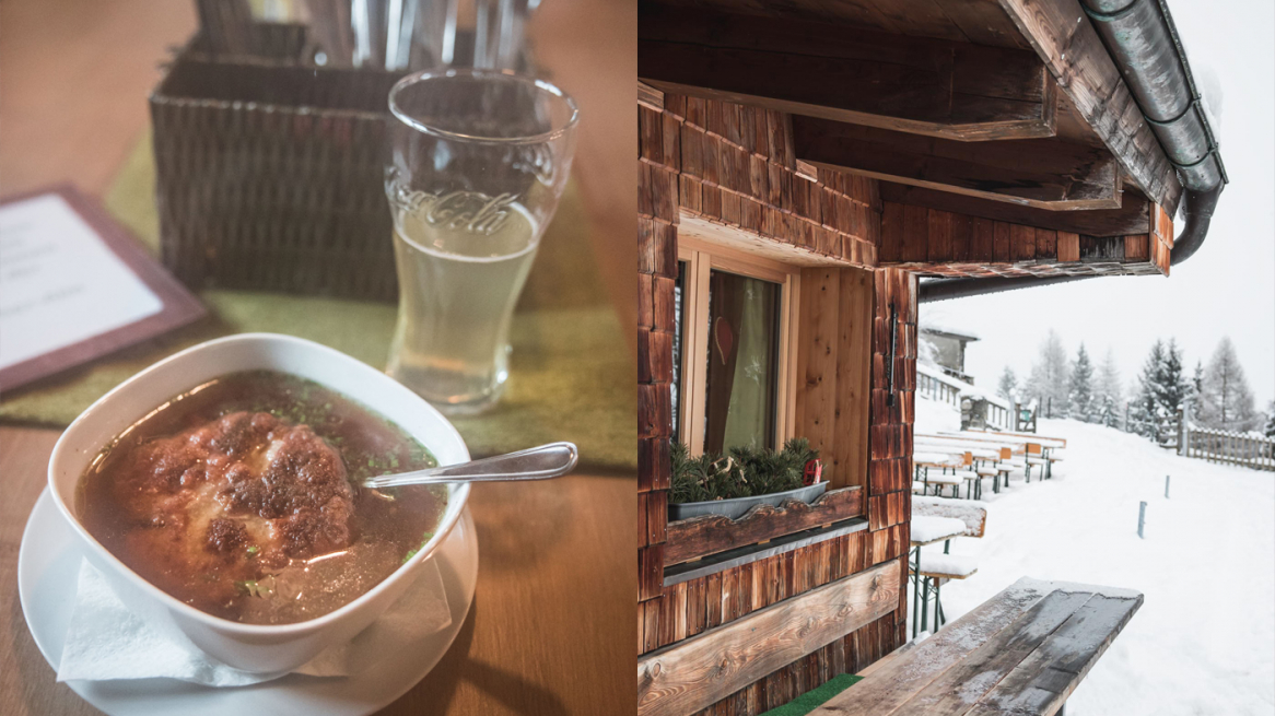 Die Speisekarte ist klein, dafür findet man hier wirklich die typischen Tiroler Speisen zu fairen Preisen und keinen Schnickschnack. Die recht deftigen Kaspressknödel in der eher würzigen Suppe sind sicherlich der Klassiker, Hirtenmakkaroni stillen den großen Hunger und der Schinken-Käse Toast den kleineren. Meistens gibt es zusätzlich noch ein bis zwei Tagesgerichte, bei meinem Besuch wären es Spinatspätzle mit Salat oder Gamswurst Aufschnitt gewesen. Für den kleine Hunger kann ich den Südtiroler Lagreinkuchen (Wein-Schoko-Kuchen) sehr empfehlen!