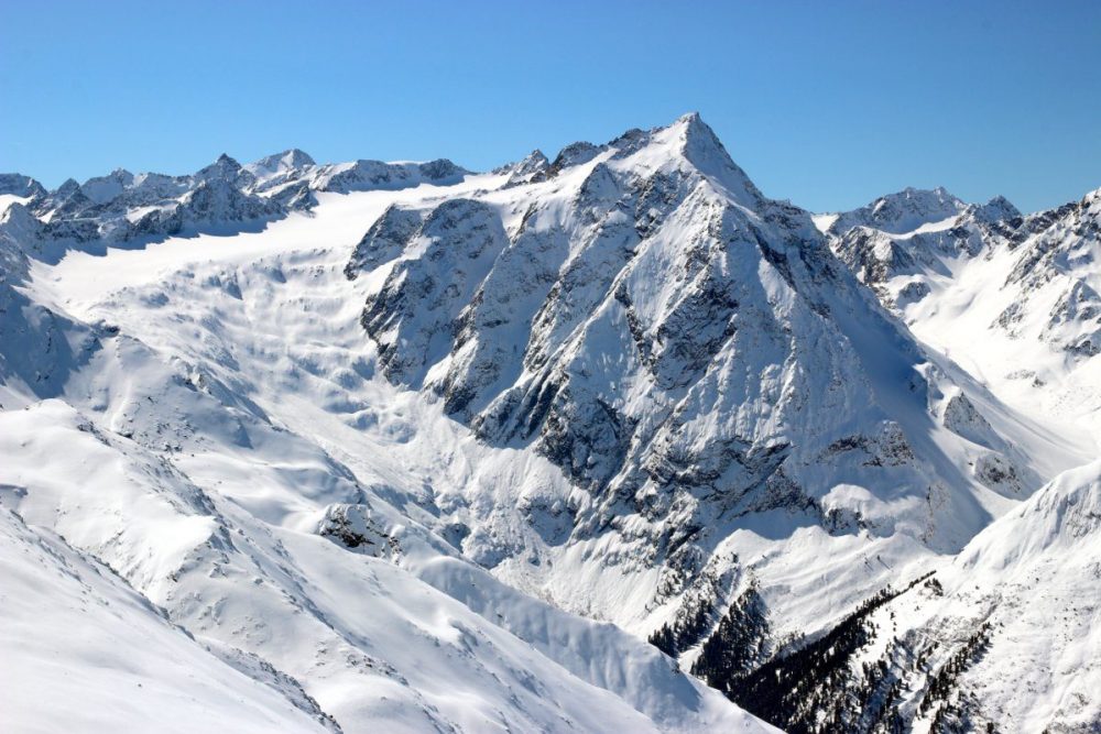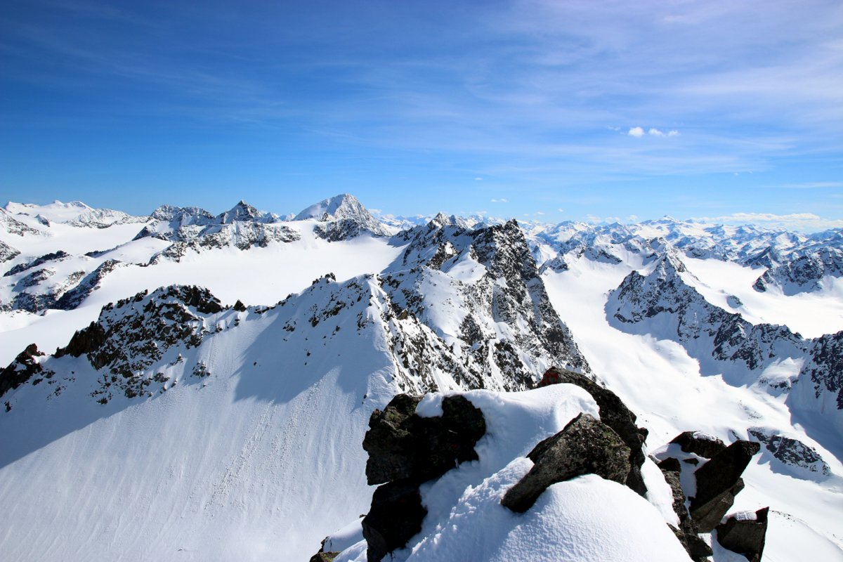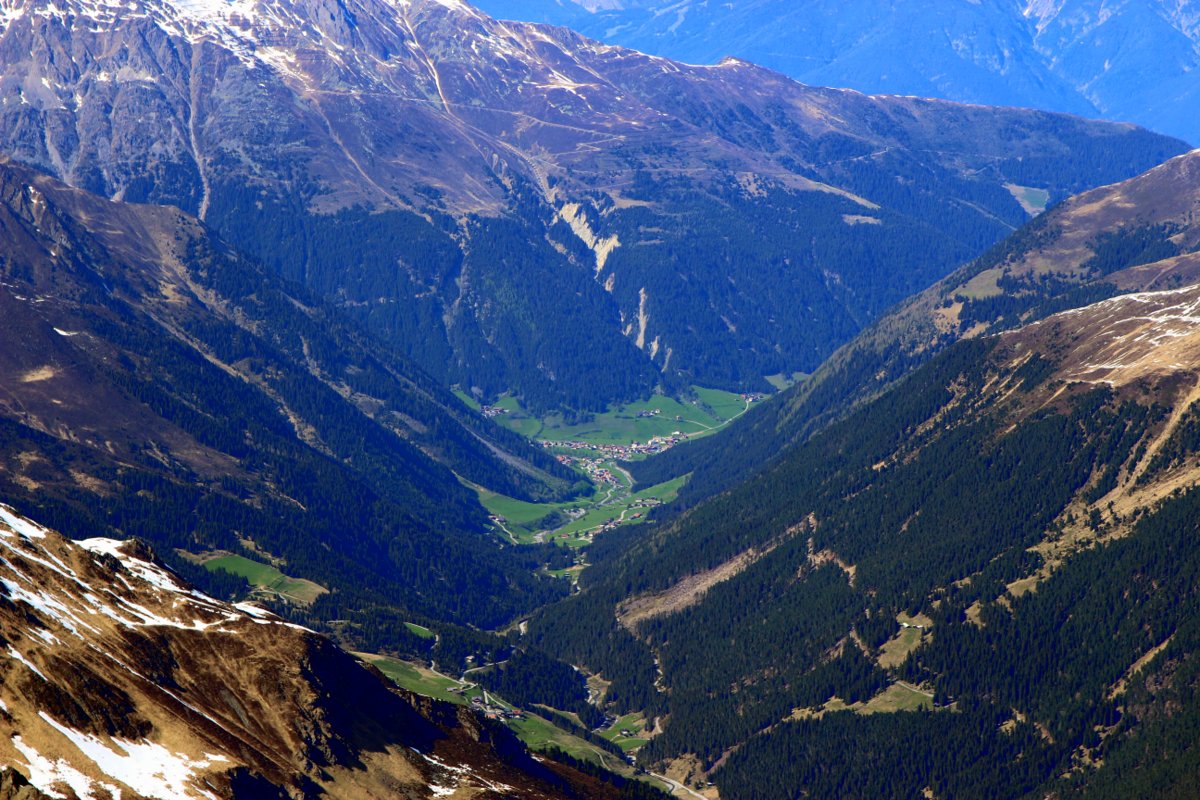 - Das Frühjahr ist die große Skitourenzeit. Das Foto wurde während des – weiter unten beschriebenen – Lüsener Express am 21.05.2016 vom Lüsener Fernerkogel nach Süden aufgenommen.