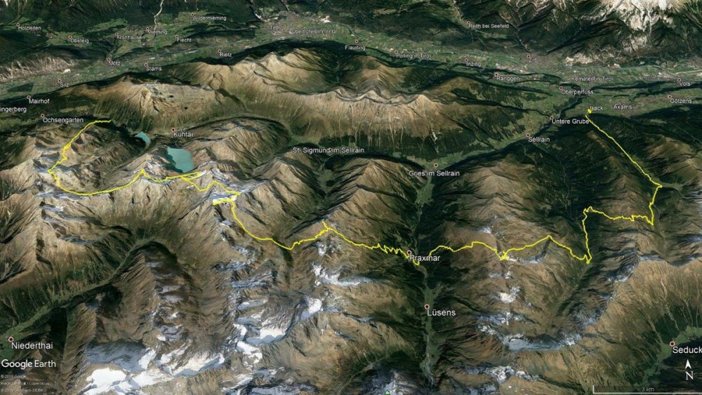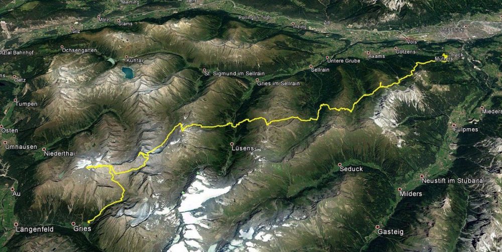 Winnebach (Ortsteil Gries im Sulztal) – Breiter Grieskogel, 3287m – Winnebachjoch – Winnebacher Weißerkogel, 3185m – Rosskarscharte – Gleirschtal – Zischgeles, 3005m – Praxmar – Roter Kogel, 2834m – Fotschertal – Schaflegerkogel, 2405m – Kemater Alm – Hoadl, 2340m – Lizum – Birgitzköpfl, 2035m – Gasthof Lärchenwald bei Mutters