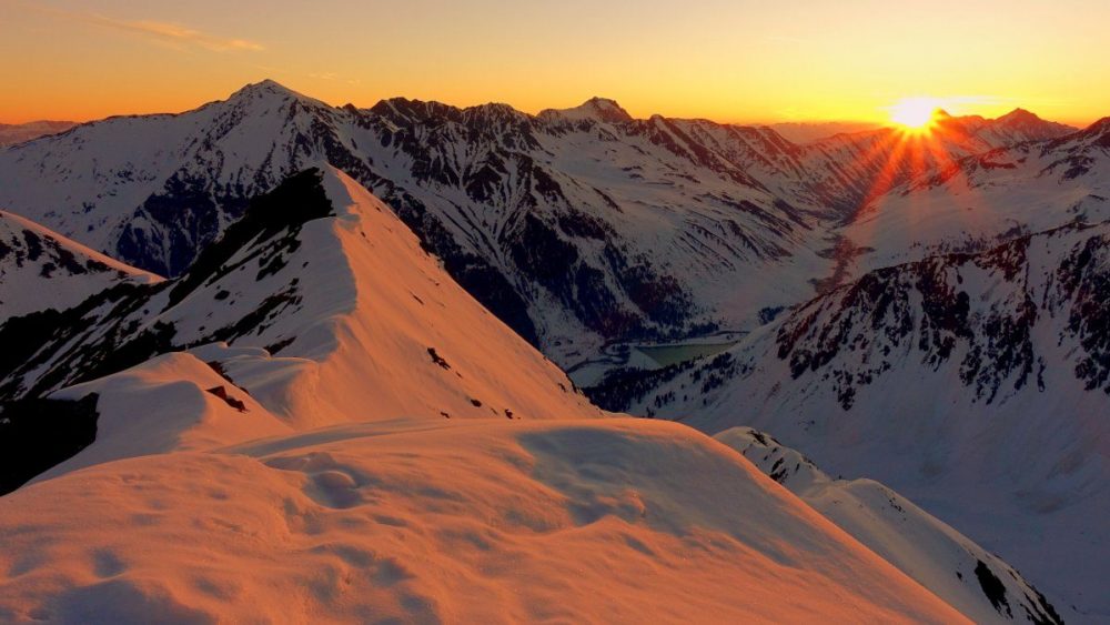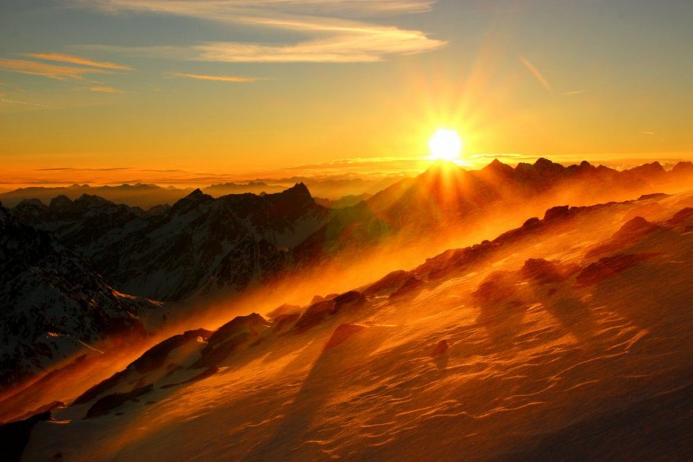 Sonnenaufgang bei meiner Orient Express Begehung. Die Sonne steht genau über dem Lüsener Fernerkogel. Links sieht man die Villerspitzen.