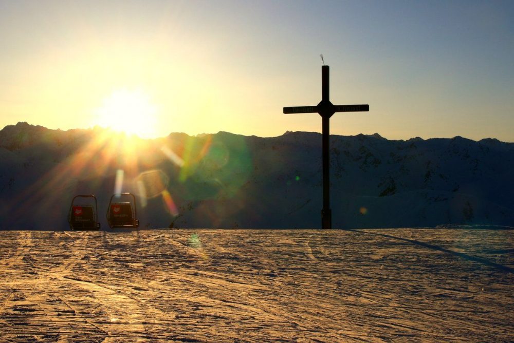 Die Sonne verschwindet wieder am letzten Gipfel, dem Hoadl. Dort befindet sich heute die höchste Bergstation des Skigebiets Axamer Lizum.