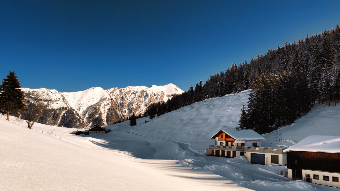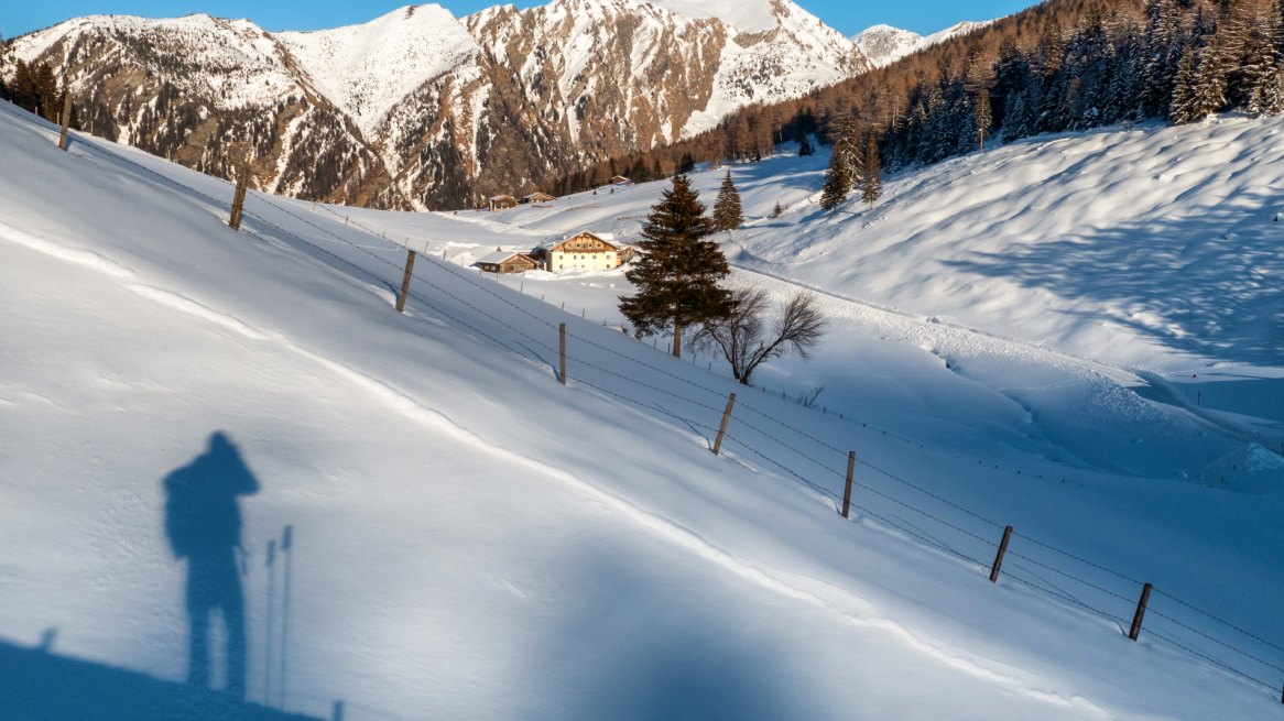 Padaun ist ein kleines Hochplateau zwischen dem Valsertal und dem Wipptal. Ein paar schöne Höfe findet man hier und im Winter auch die klassischen Motive für tolle Fotos. Für unsere Schneeschuhtour zum Padauner Kogel gehen wir von den Häusern die Straße weiter Richtung Westen, die hier wieder ein wenig bergab führt. Beim letzten Hof, dem Larcherhof, finden wir einen Wegweiser, der uns den Weg zum Padaunerkogel angibt. Hier wird es Zeit, die Schneeschuhe anzuschnallen, denn es geht nun ins Gelände.