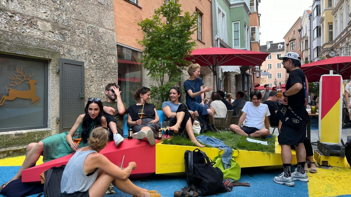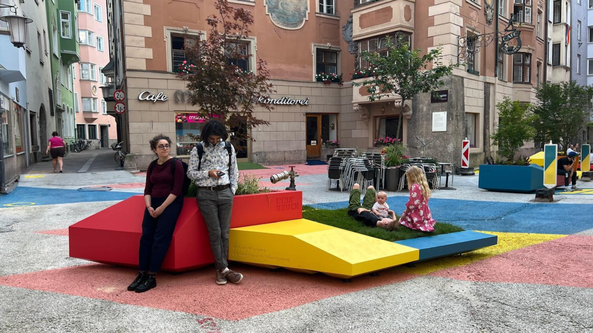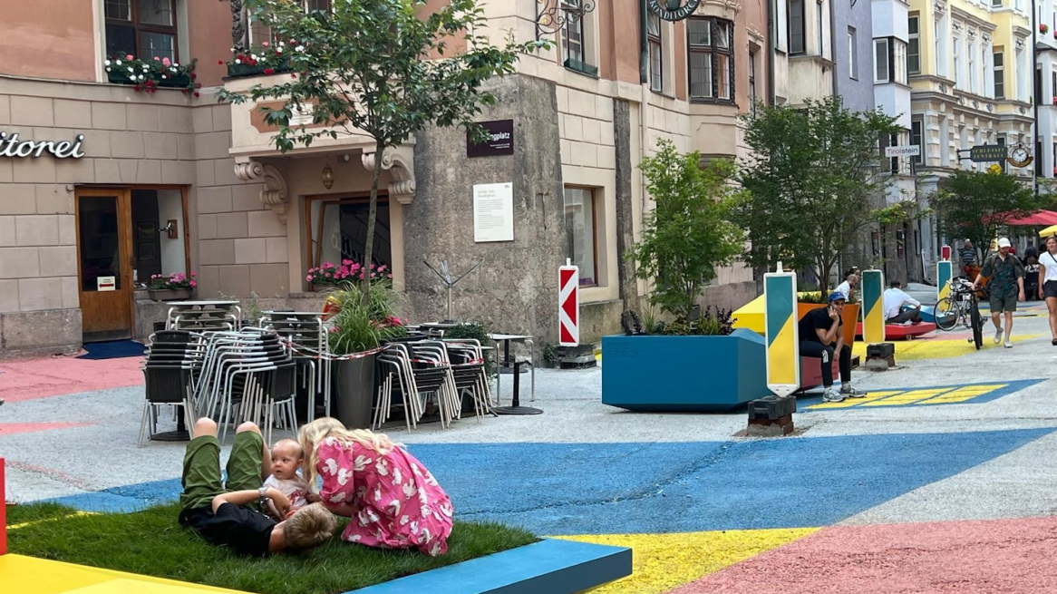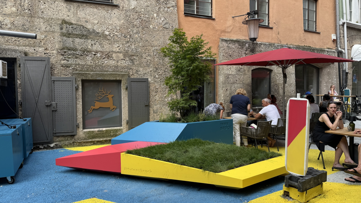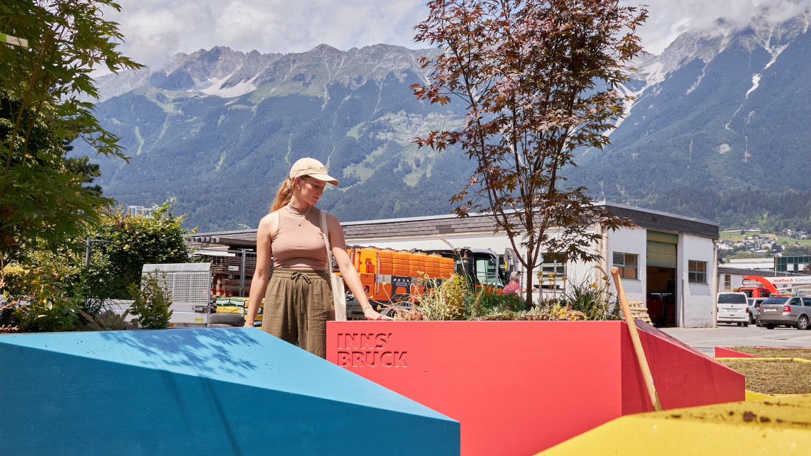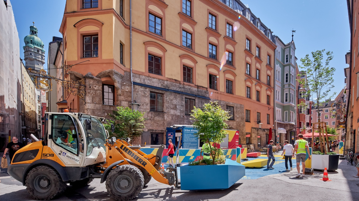 "Just yesterday, we painted the entire alleyway with Tirol Lack and 30 motivated people," says Andrè Lomsky, Regional Manager at Innsbruck Tourismus. I reach him by phone in the middle of the construction site just a few days before completion. The historic Kiebachgasse is currently being converted into an art space and as soon as the first Urban Blooms are up, the first children are already playing there. The modules, which can be combined in many different ways, look like colorful building blocks and offer shady cooling, green seating and lounging areas as well as play and climbing facilities. They deliberately appeal to the play instinct of older children and invite them to step onto them with gentle slopes. Large shrubs and green areas add a welcome splash of color to the gray of the construction site, provide shade and bring nature back. The spectacle in the old town is expected to continue until the end of August/beginning of September, when the construction site will be finished. Like flowers in the snow (or the trees in Leeuwarden), the colorful blooms will then continue to wander through the city and blossom elsewhere, reveals Lomsky. The pilot project in Kiebachgasse is therefore also a bit of a test run - and a very promising one at that.