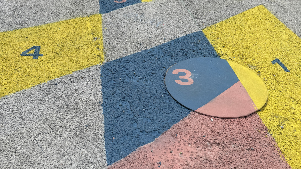 A street becomes colorful: Hopscotch, chess & TicTacToe.