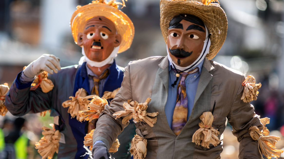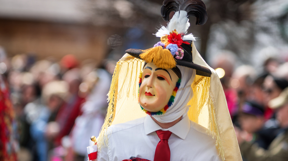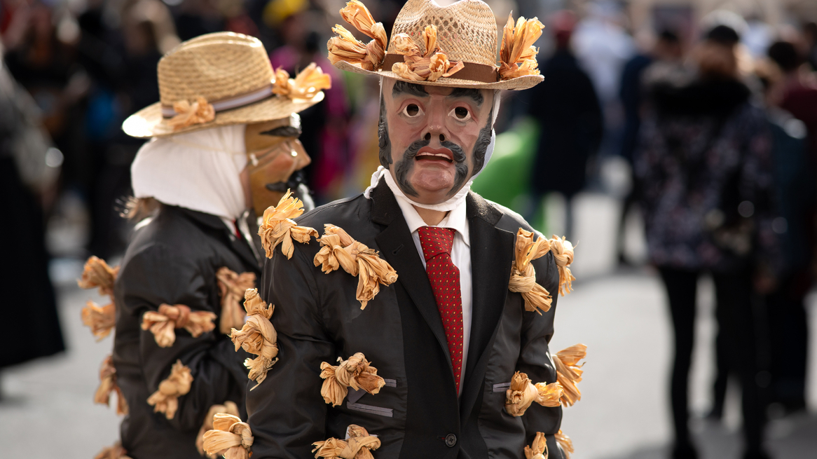 The Flitscheler represents another traditional carnival figure and symbolizes fertility. The „Flitschen“ are dried leaves from the corn cob and are attached to a suit. The suit is worn inside out so that the seams are facing outwards. This figure also includes a wooden mask and a hat, which is also decorated with „Flitschen“. The Flitscheler wear around 120 processed corn cobs on their costume.