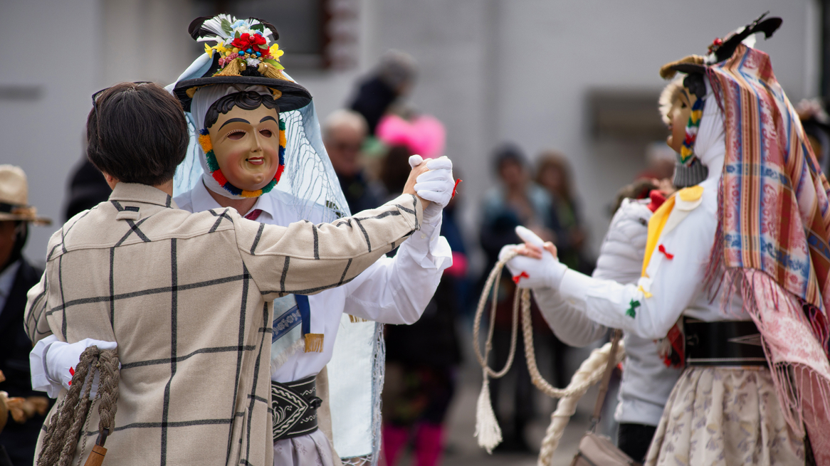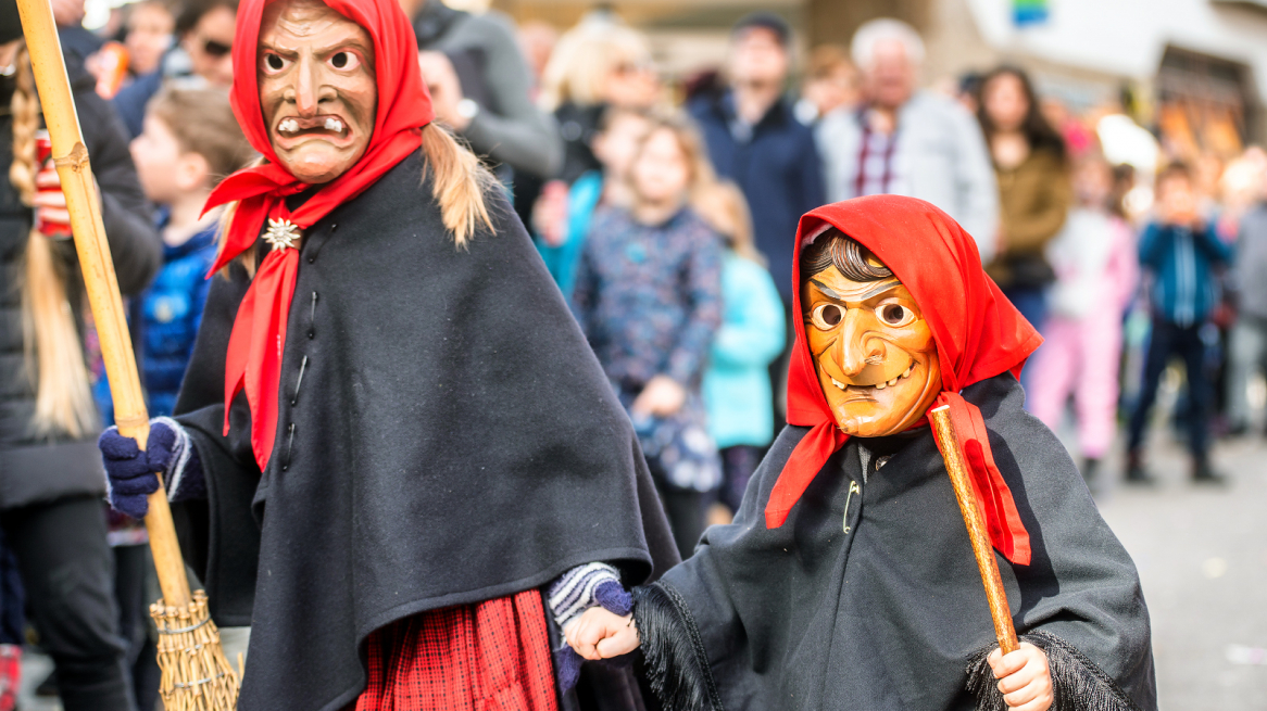 The Axamer Kögelehexen are traditional carnival figures. Their outfit consists of a shawl and a silk apron, and they are complemented by the so-called „Nadln“. Compared to other witches, the masks of the „Nadln“ are characterized by somewhat softer facial features. Instead of a broom, the „Nadln“ carry a stick, also known locally as a „Hoagiler“. This is not only symbolic, but can also be used by the „Nadln“ for a light blow if necessary, especially when they are angry.