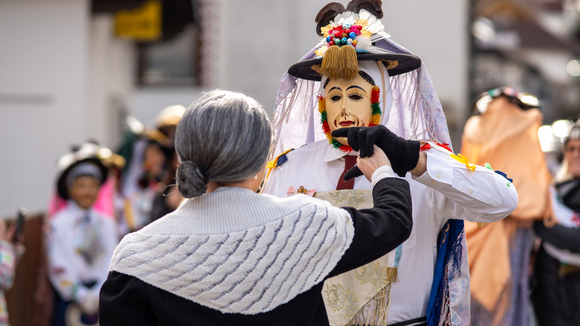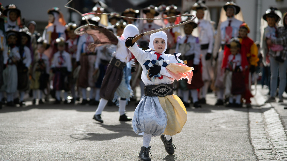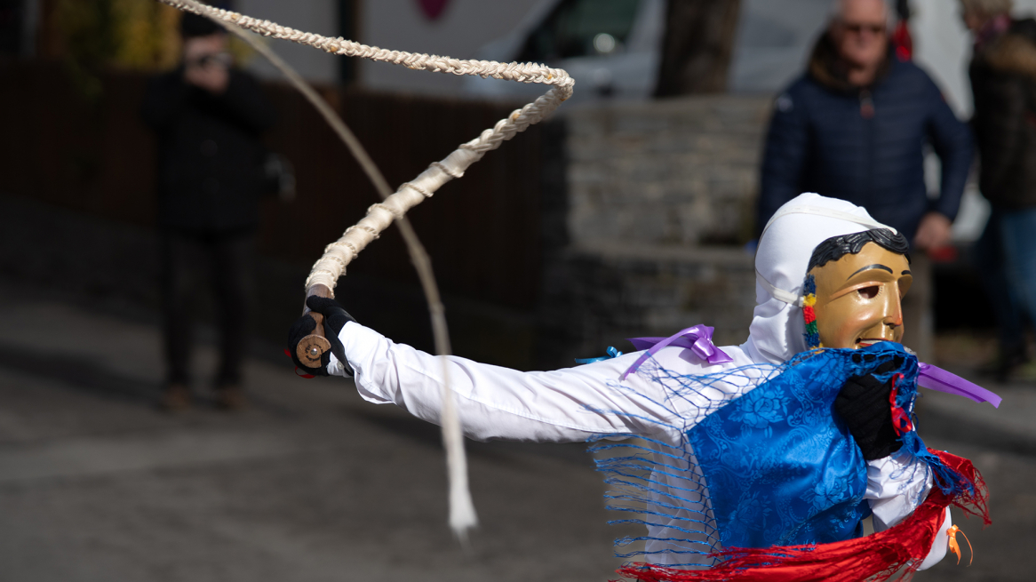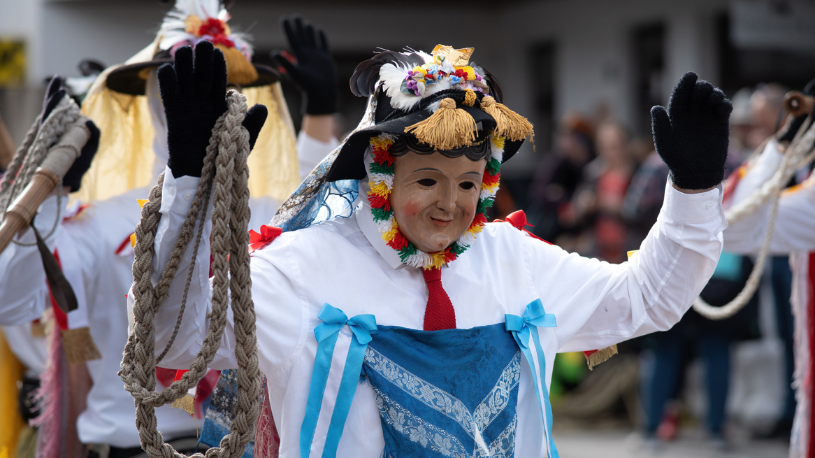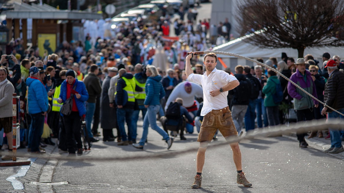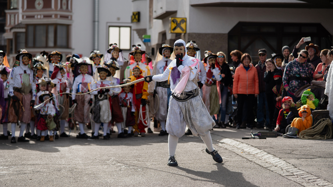 The Tuxer embodies a young, powerful and elegant man. The lively scarves, often made of silk, and the Zillertal women's hat, decorated with flowers and feathers, symbolize spring. In addition, the Tuxer carries a „Goaßl“ (whip), with which he „schnöllt“ (snaps). Through this ritual, he charmingly captures pretty girls, which is considered a special honor. A girl can "free" herself from the Tuxer with a dance or a schnapps.