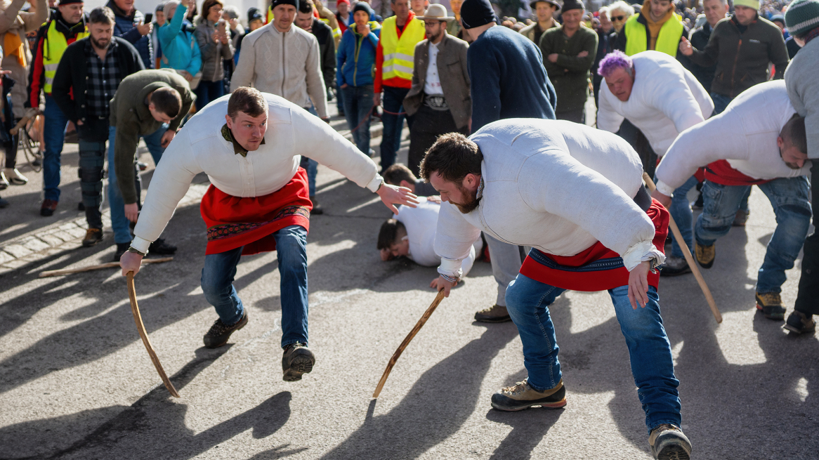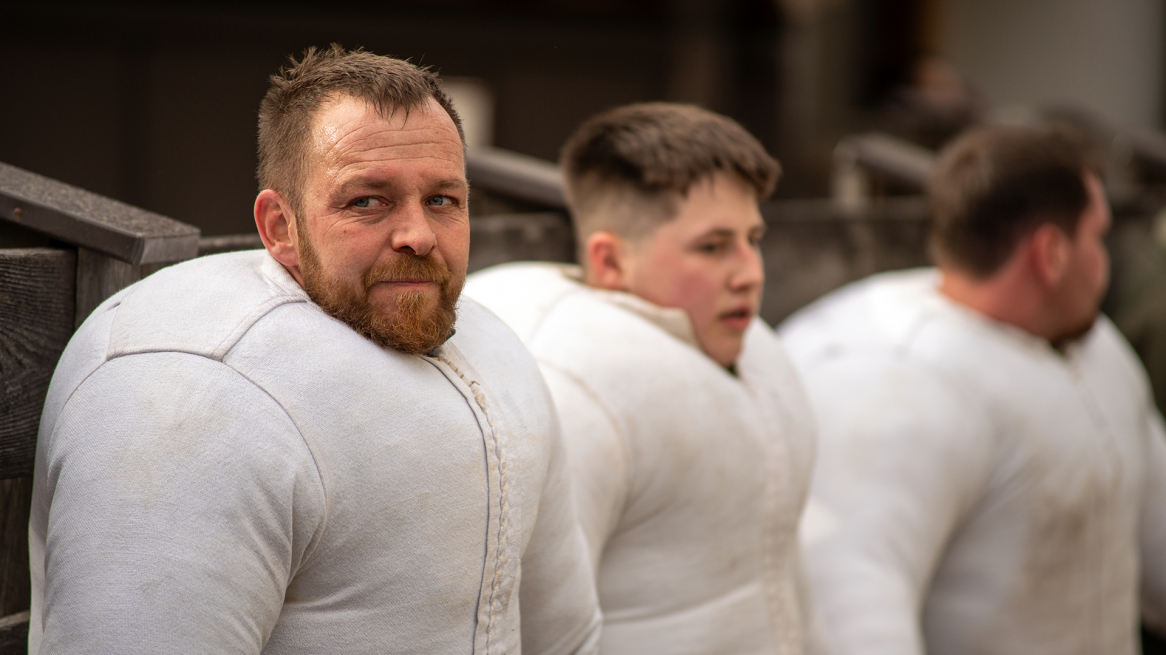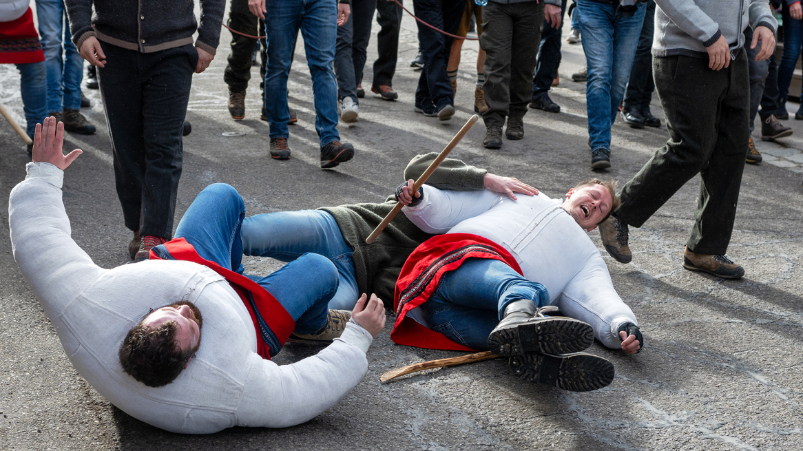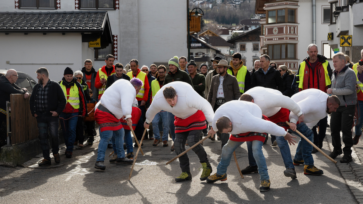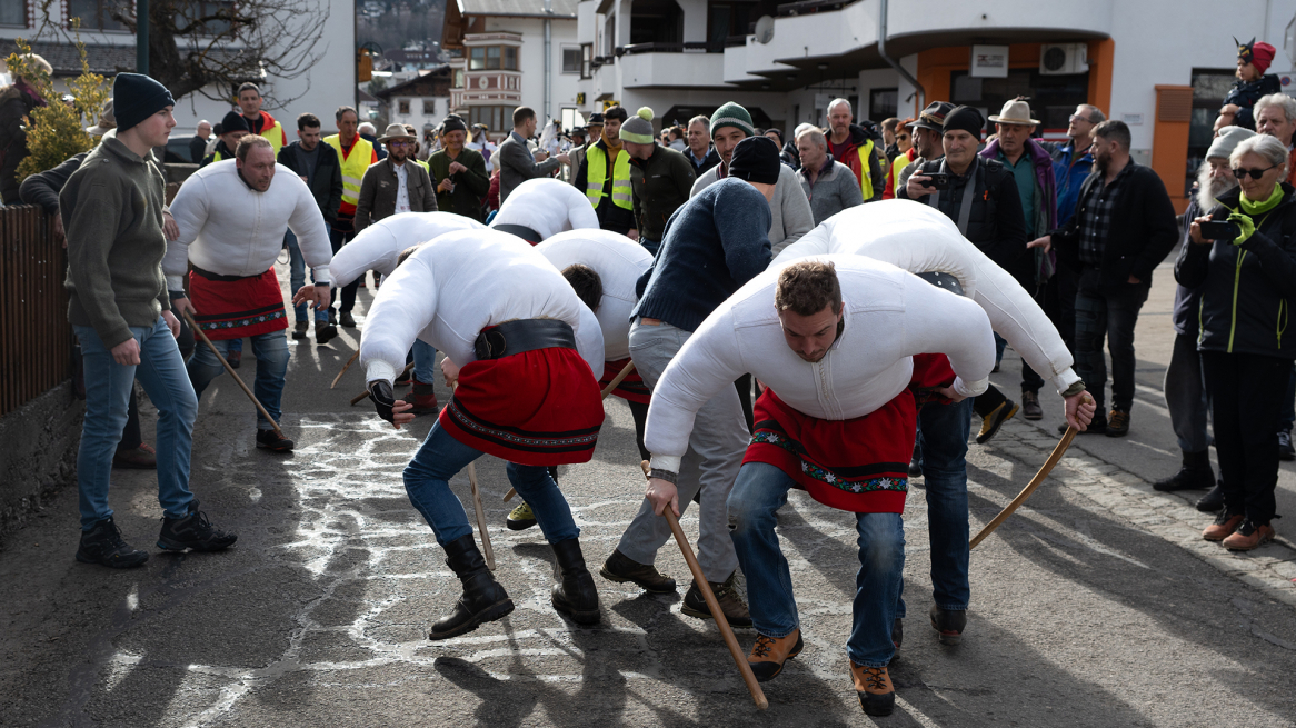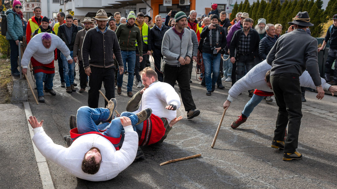 The so-called riders, their opponents, have the task of attacking the wampelers from behind and throwing them onto their backs. While the attacks may only be made from behind, the wampelers can defend themselves from the front with their stick. The best wampelers are those who still have a white back after the two village rounds, which means that they have not been knocked down.