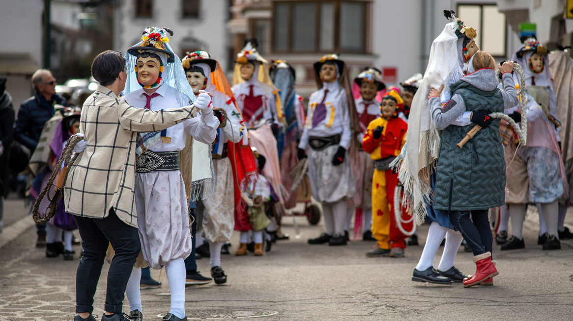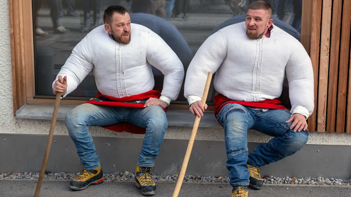 The Wampeler are strong men whose white shirts are filled with hay and straw. They are also equipped with a stick. Legend has it that in the past, people padded themselves with leaves when hunting bears to protect themselves from injury. The wampelers dress in a coarse, white Pfoat (shirt) made of linen and wear a red skirt over trousers, a wide leather belt, sturdy shoes and a stick - both for balance and for defense. Filled with their „Grummit“, the hay from the second mowing, they move through the village in a crouched position. At first glance, this may seem sedate, but in reality it is extremely strenuous. The course of this exhausting custom is governed by clear ("iron") rules.