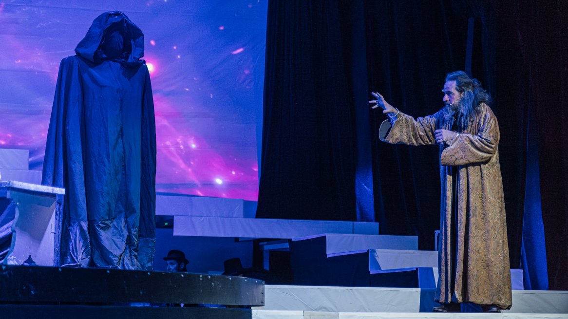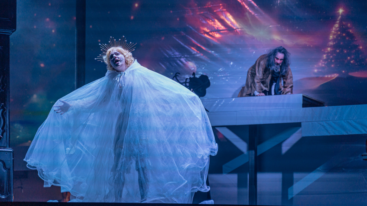 Back: The Ghost of Christmas Past (Verena Mumelter-Redolfi) lets Scrooges look into his own past. Photo: Mathias Brabetz Photography