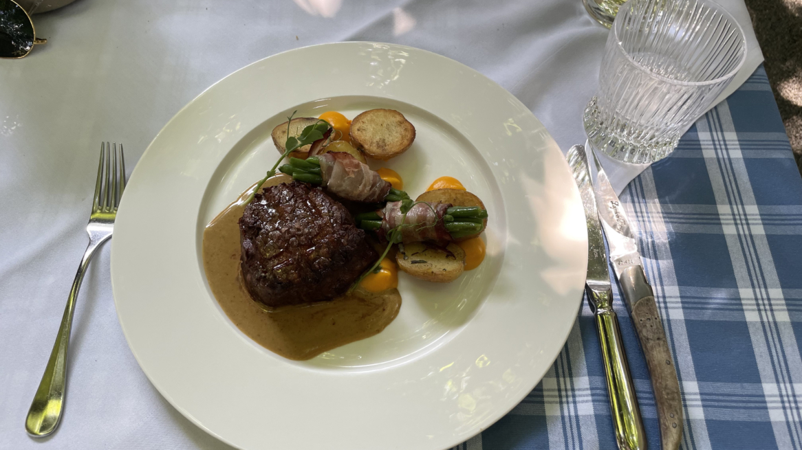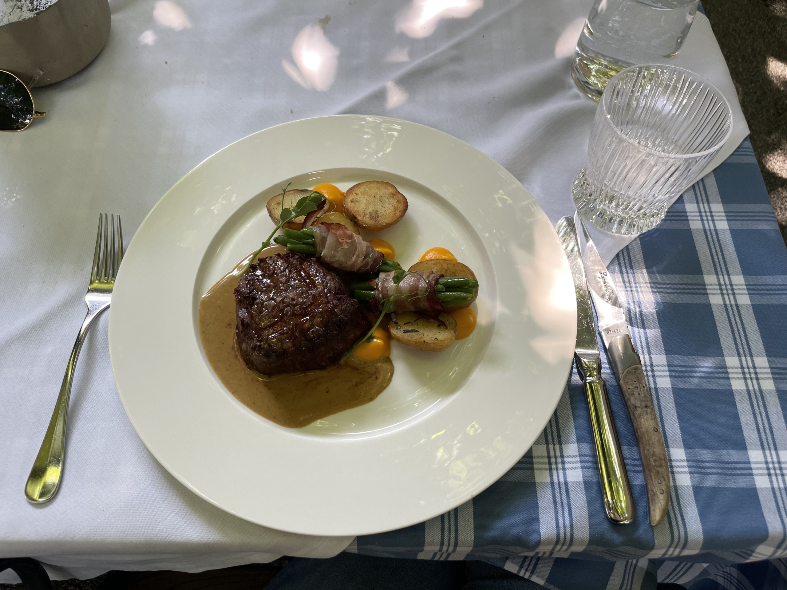 Fleisch und Kartoffeln, nicht zu vergessen die mit Speck umwickelten grünen Bohnen. Un clásico de Austria, ¡y tan bonito!