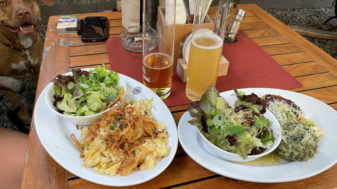 En verano, la sombreada terraza del jardín se convierte en un animado punto de encuentro donde lugareños y visitantes se reúnen para compartir una comida, una cerveza y una buena conversación. Es este espíritu cálido y orientado a la comunidad lo que hace que Gasthaus Riese Haymon sea una parte tan querida de la escena culinaria de Innsbruck. En mi última visita, la gente era tan amable que entablaban conversación y brindaban por sus cervezas con las mesas vecinas. Yo personalmente no podía decidir qué comer, así que por suerte había un ‘Tiroler Tris’ en el menú, que ofrecía tres de mis platos tiroleses favoritos en un solo plato: Schlutzkrapfen (un plato de pasta similar a los raviolis o pierogi relleno de espinacas y queso), Spinatknödel (albóndigas de espinacas tradicionales servidas con mantequilla derretida y queso parmesano) y un Kaspressknödel (una albóndiga plana prensada y gratinada con queso). Sinceramente, si un [notrans]Tiroler Tris está en cualquier menú, ¡es mi primera opción!